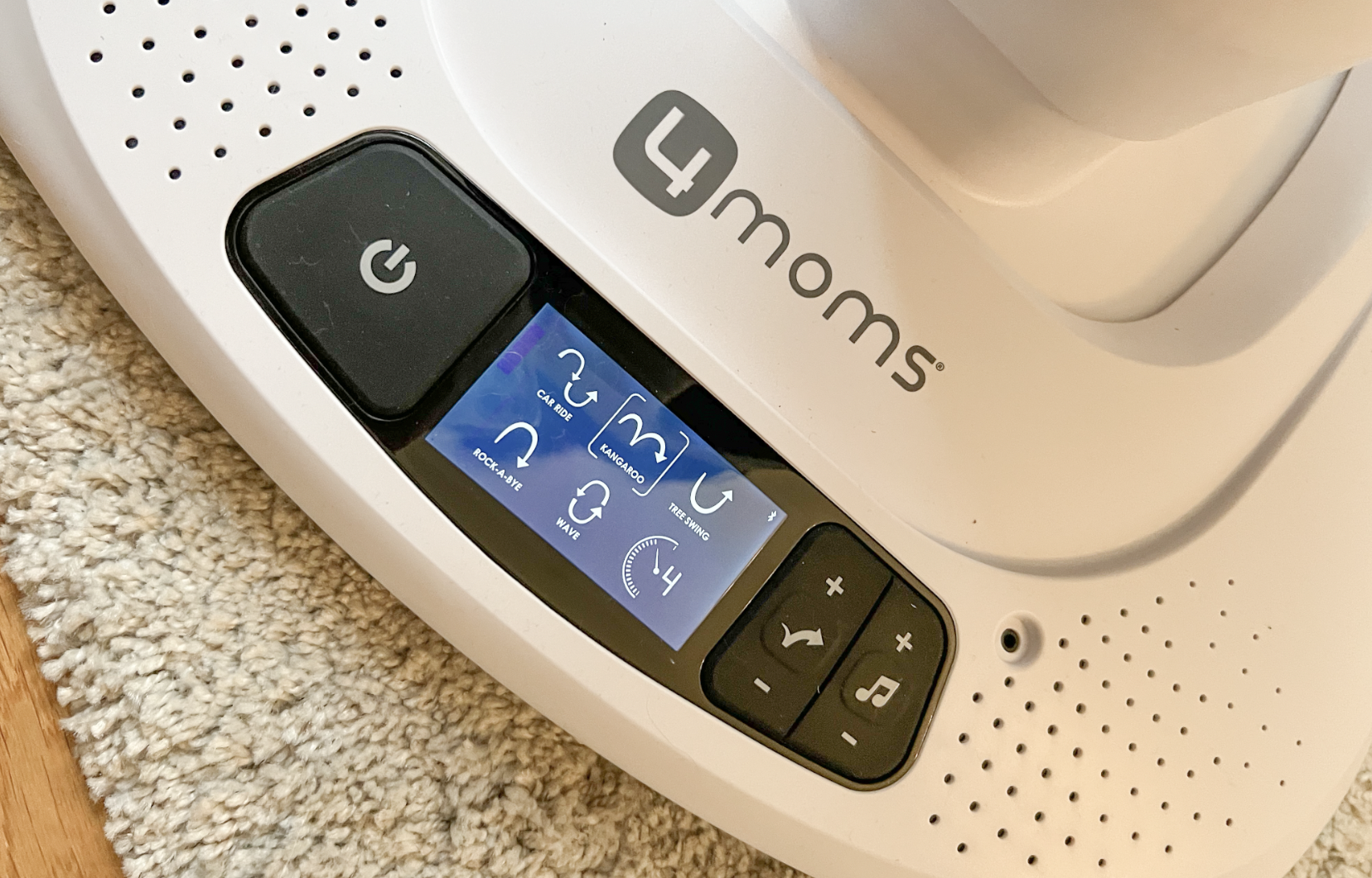 4moms mamaRoo är en stor och lite tyngre babysitter som guppar upp och ned och vaggar. Babysittern är utrustad med hela fem stycken olika rörelseinställningar och fem olika hastigheter. Man kan kan välja mellan rörelserna mamaRoo car ride, mamaRoo kangaroo, mamaRoo tree swing och Swing. Babysitter guppar upp och ned och vaggar från sida till sida, precis som man gör när man själv vill lugna och trösta sin bebis. Bebisen känner igen rörelserna och gör den lugn.