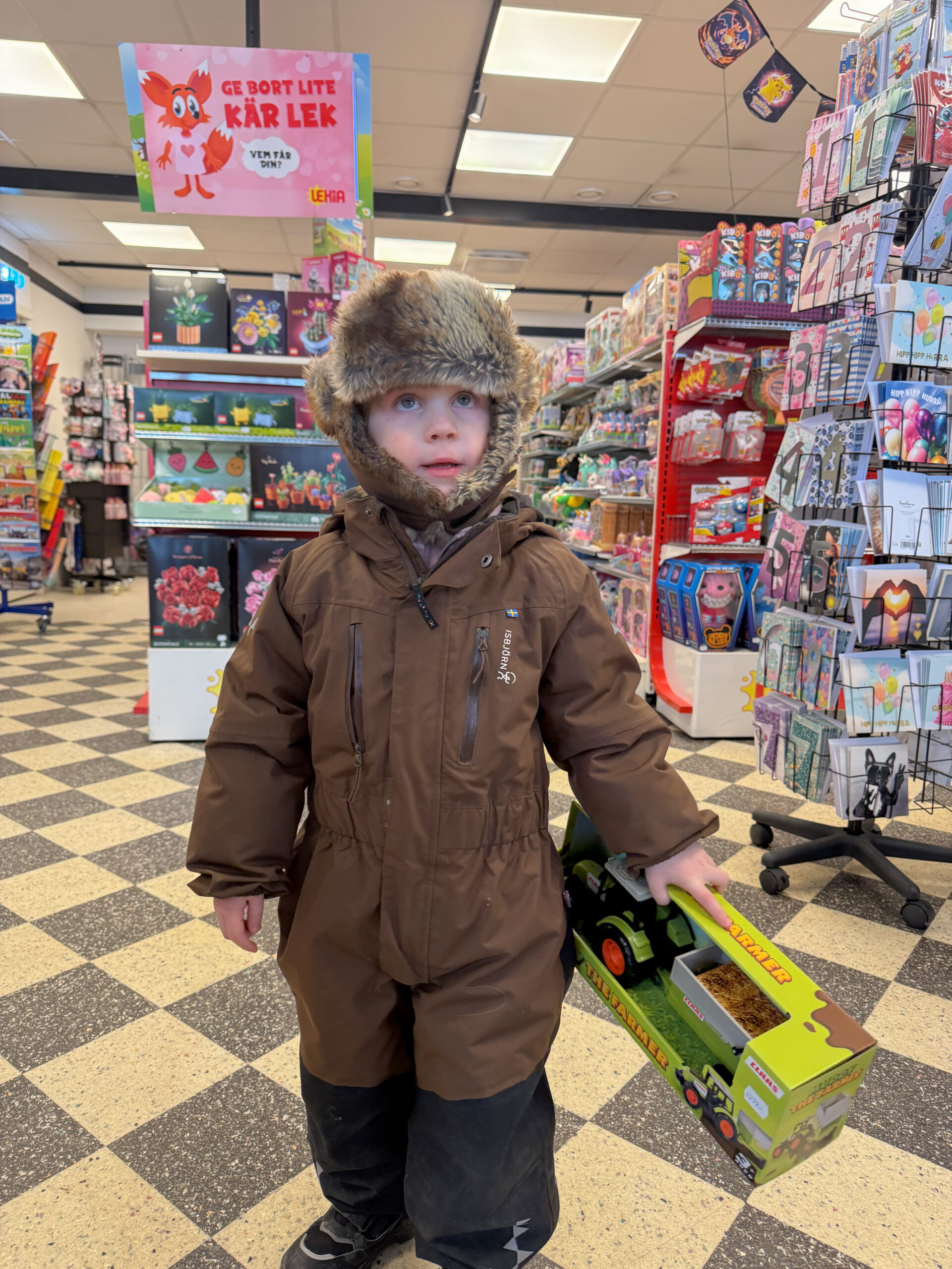 Leonard valde en traktor med släp inne i leksaksaffären idag 🙂 så glad!!