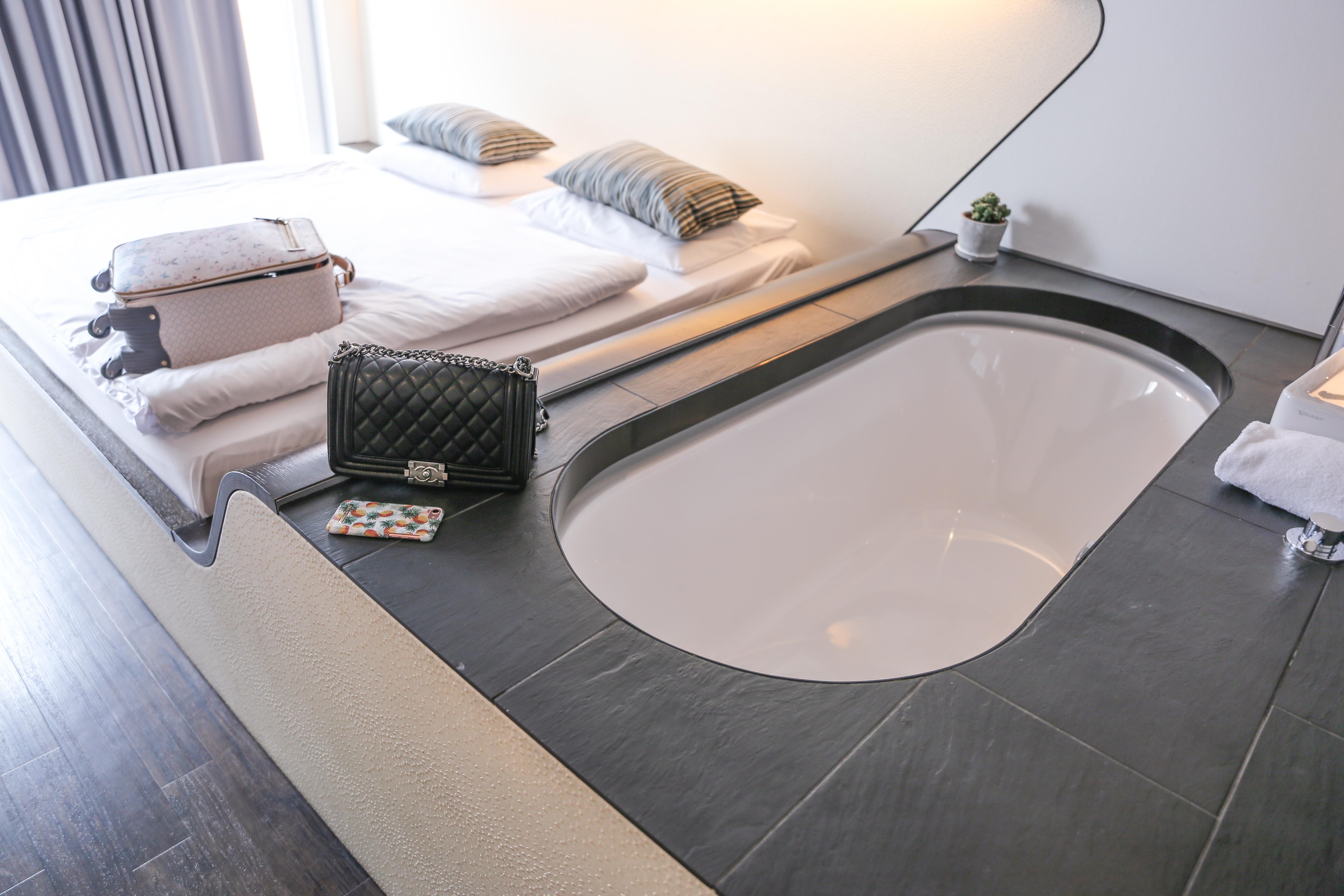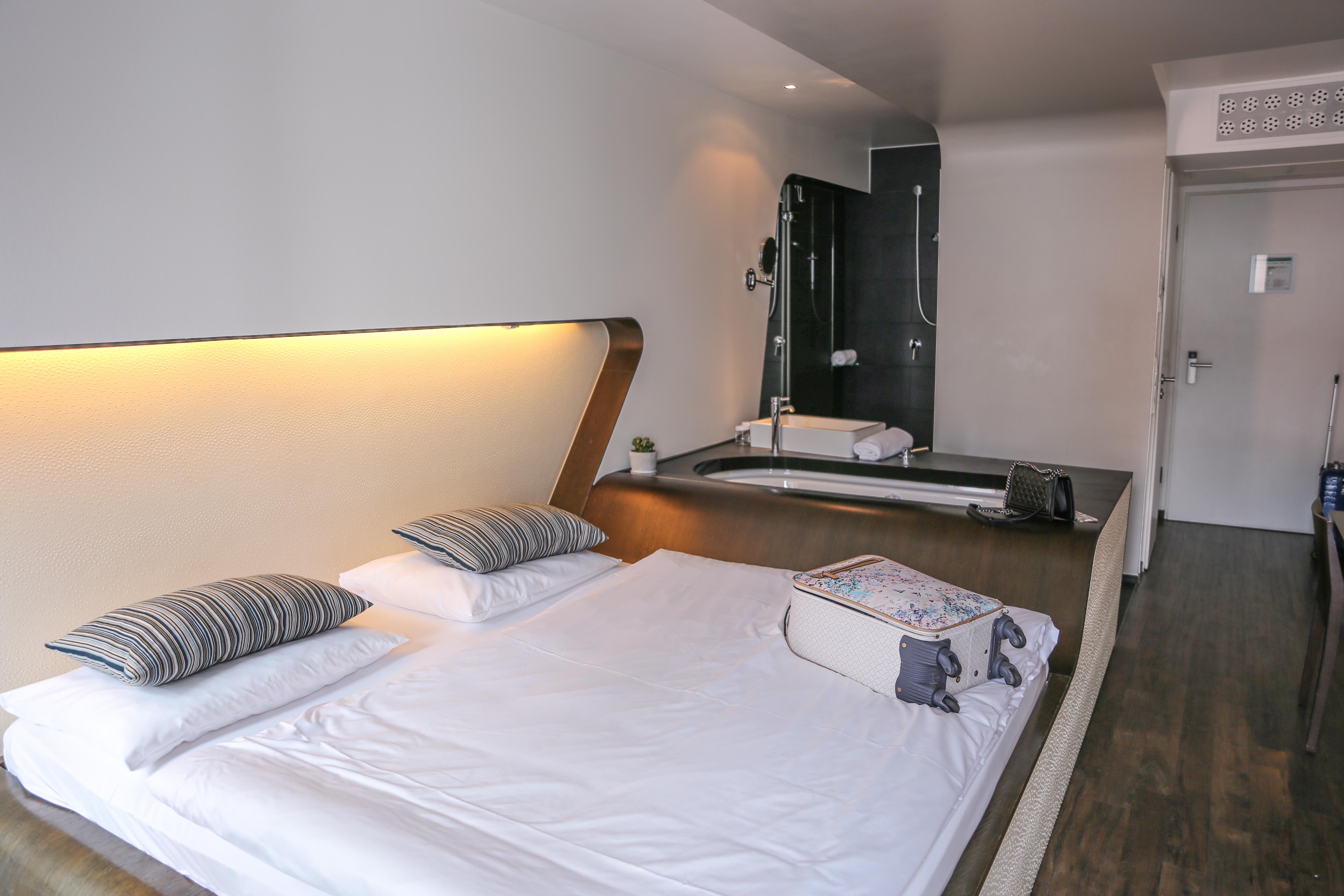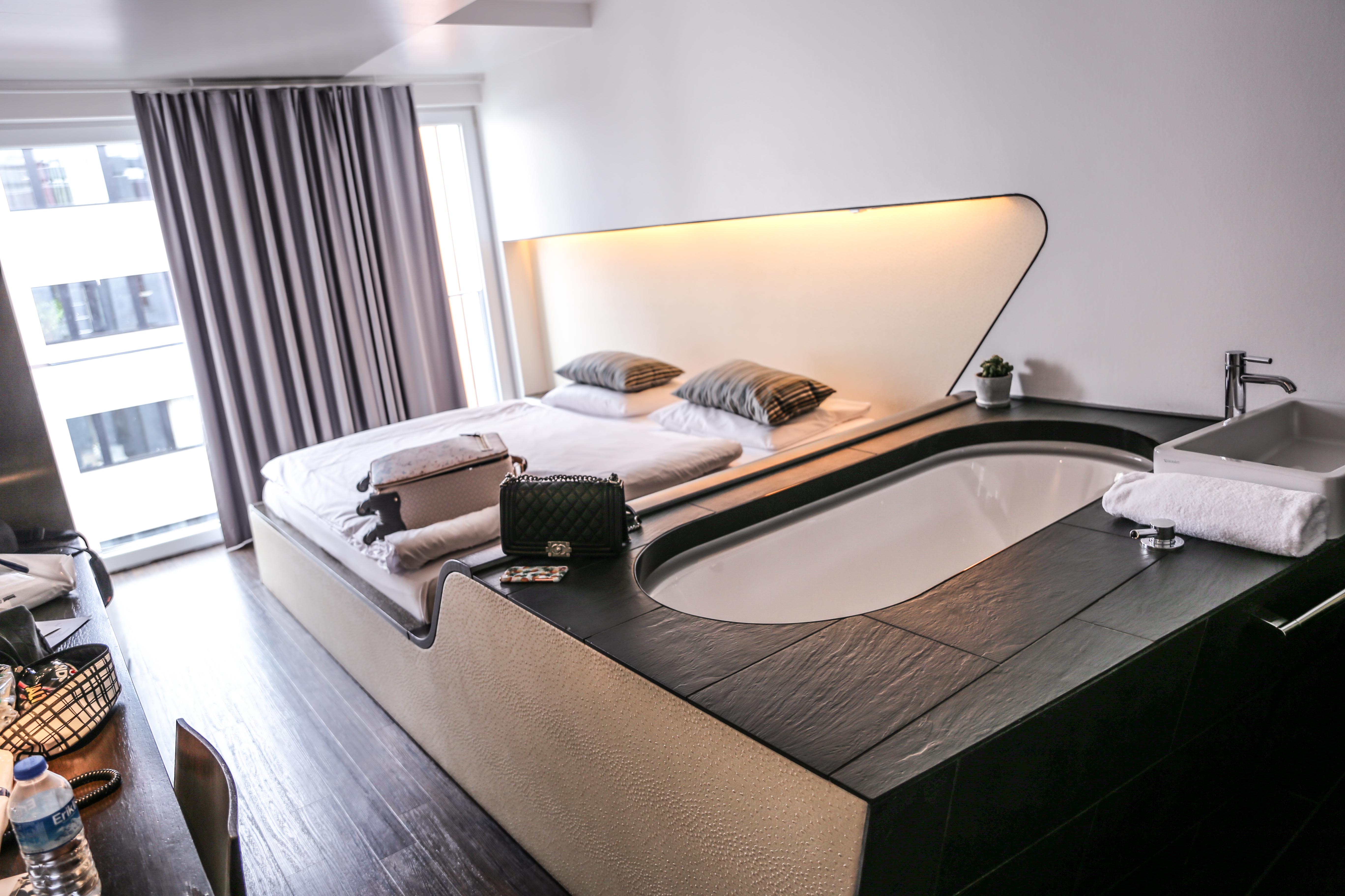 Nu ligger jag som en strandad säl i vår King Size bed i sviten högst upp på Hotell Q i Berlin.