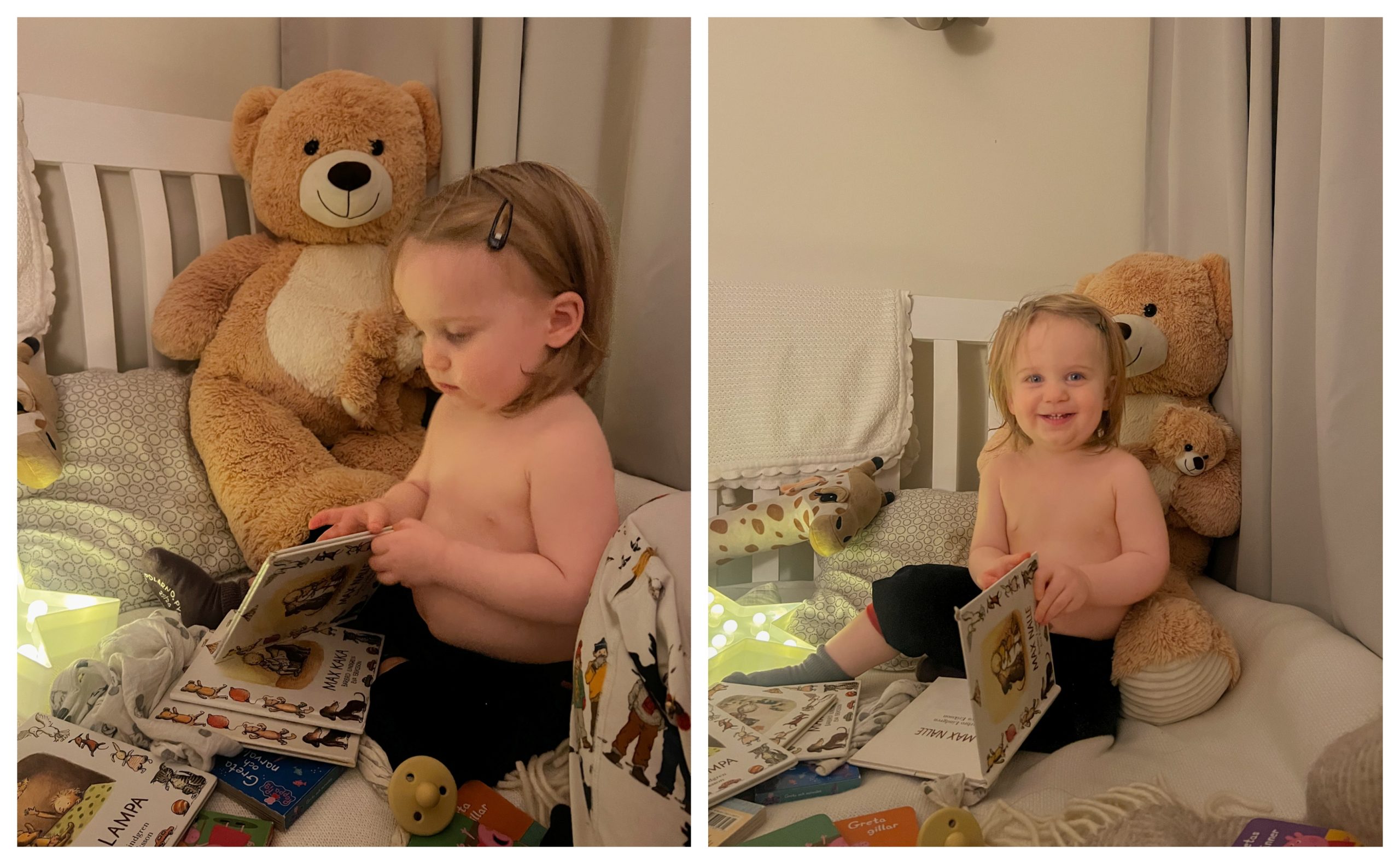 Gårdagens bokläsning. Vi läser varje dag och Leonard älskar det