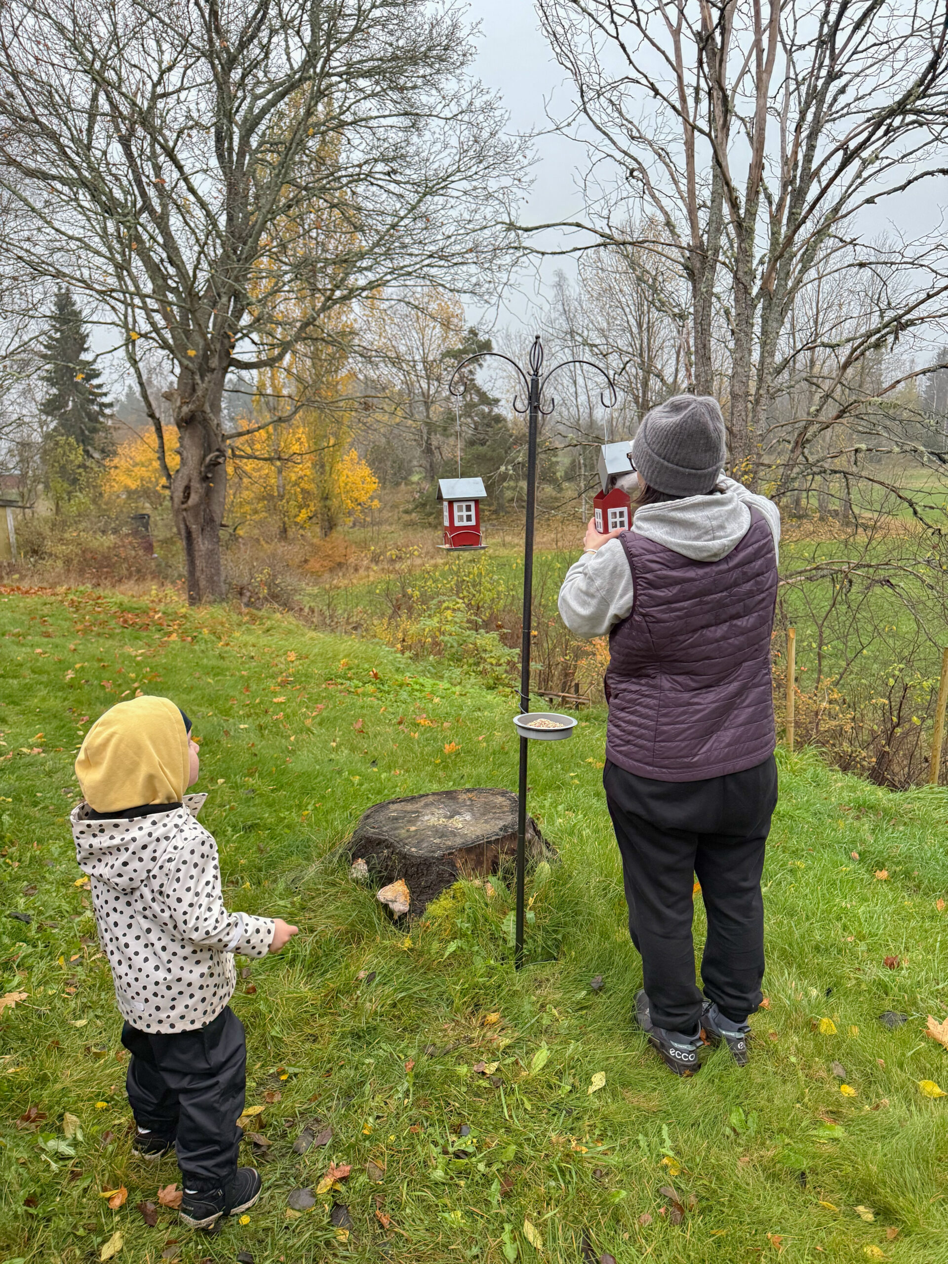 Här sätter vi upp den nya fågelmataren. Så fin!!