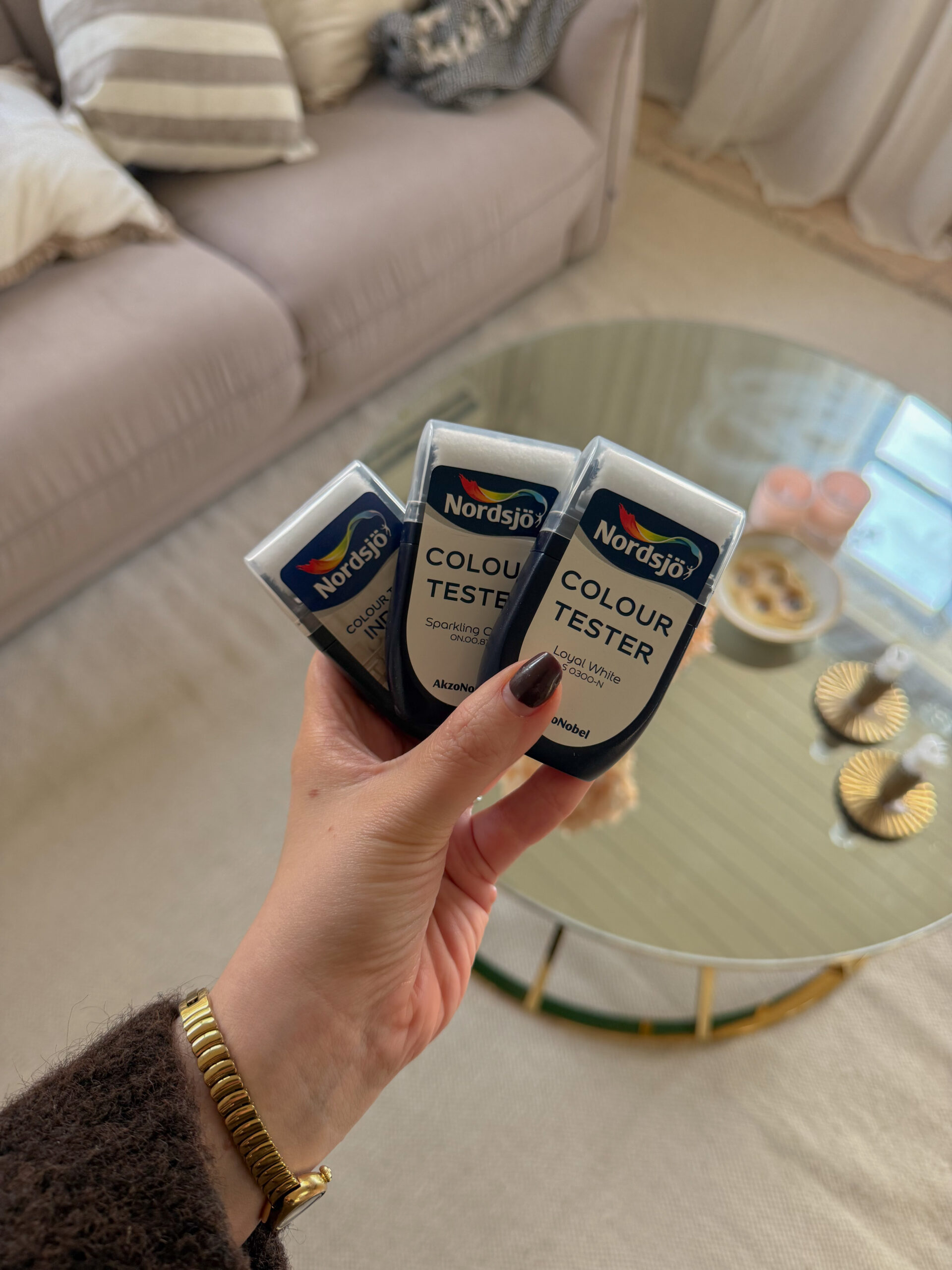 Vi har testat lite olika färger på hallväggen på nedervåningen. Vi måste fylla på med färg längst med karmen vid den nya dörren.