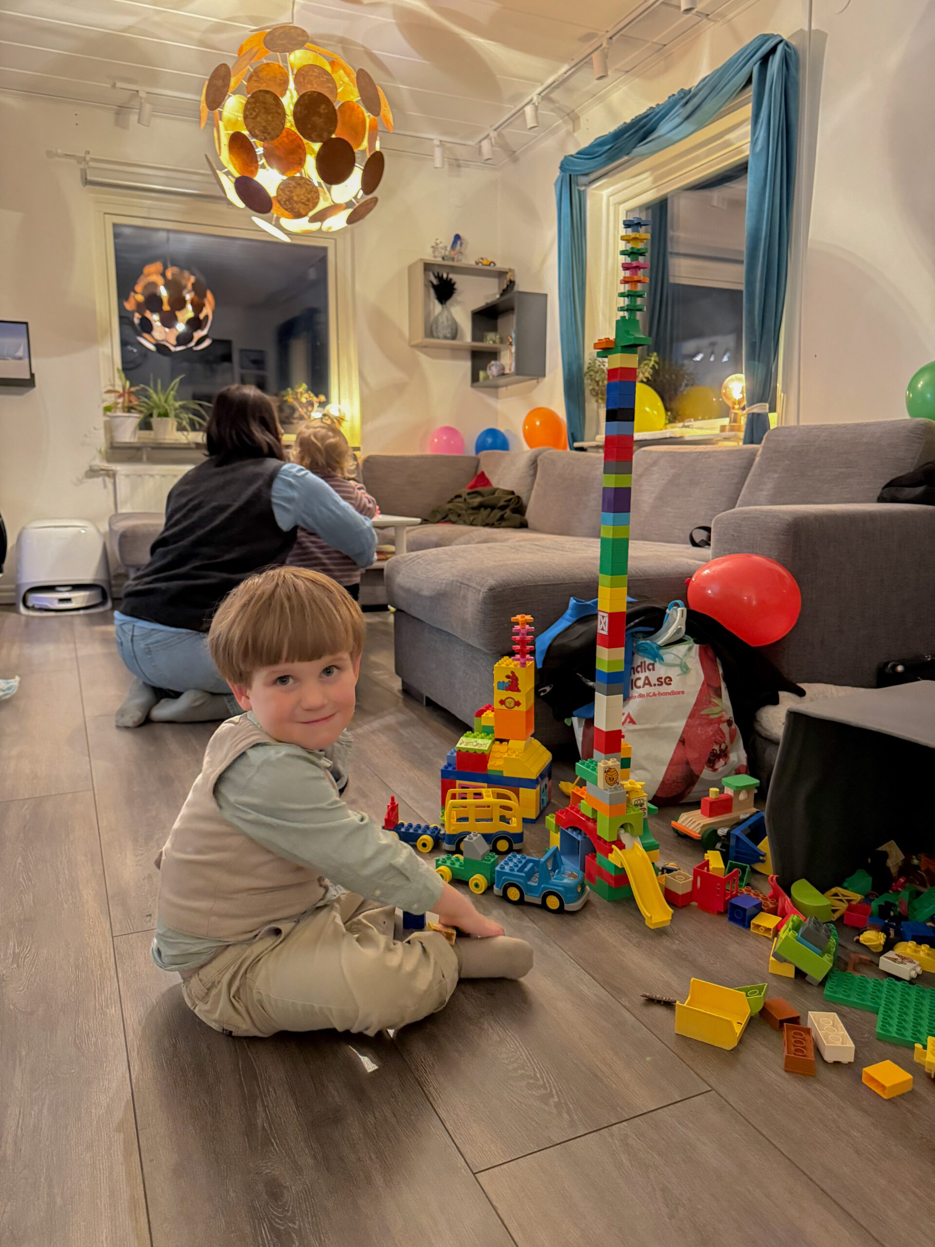 Lördagen var så mysig. Först åkte vi till barnens kusin i Västerort på fika och lek. Det är bara ett år emellan vår stora och kusinen. Oftast leker Cornelis och Leonard så bra, men ibland tjivas dem som syskon. Efter fika och playdate så åkte vi vidare till kalas. Livias kusins barn fyllde år och dem hade bjudit in på middag. Vi fick SÅ god mat och dryck hela kvällen lång. Födelsedagsbarnet och Leonard spelade Mario Cart medan vi vuxna satt och tjattrade. Det var premiär med Tv spel för Leonard. Succé tyckte han!