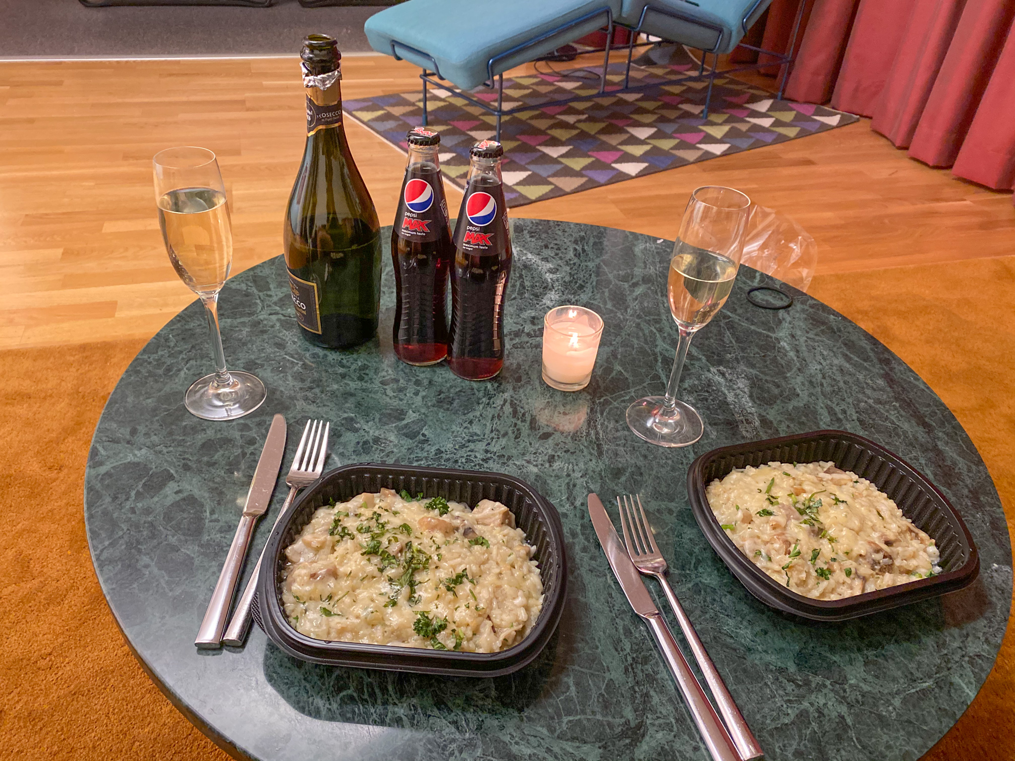 Vi beställde mat från en Italiensk restaurang. Jag älskar risotto.