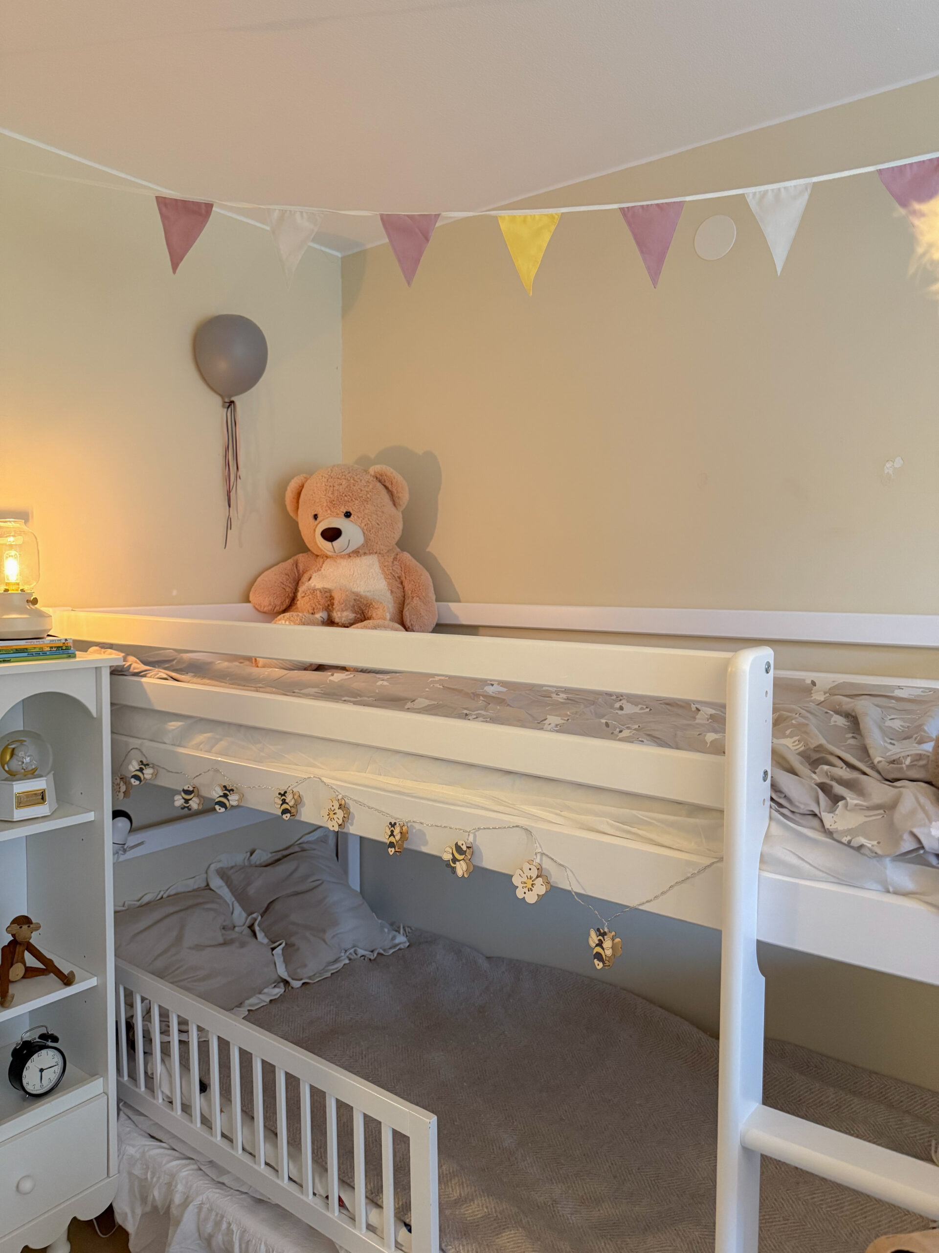 Sängen är precis allt vi hoppades på – tidlös i designen, men samtidigt lekfull och rätt enkel. Det är något speciellt med möbler som både är vackra och praktiska, och den här sängen lyckas verkligen med båda delarna. Att kunna skapa två sovplatser utan att ta upp mer golvyta känns perfekt i barnrummet. Den nedre bädden fungerar dessutom lika bra som myshörna på dagen – vi har redan fyllt den med kuddar, filtar och små ljusslingor. Vi satte även en liten kan där eftersom lilla B är så liten än. Vi vill inte riskera att han ska ramla ur. Denna kanten är gammal från storebror.