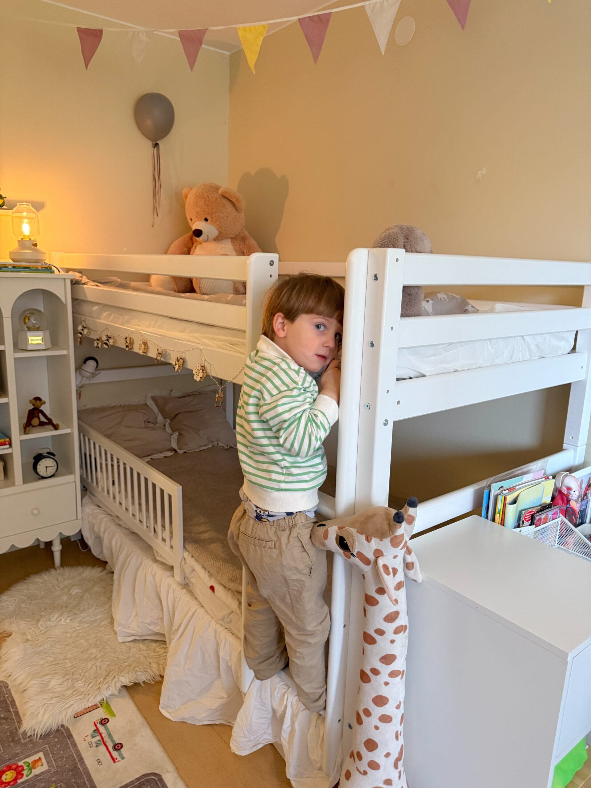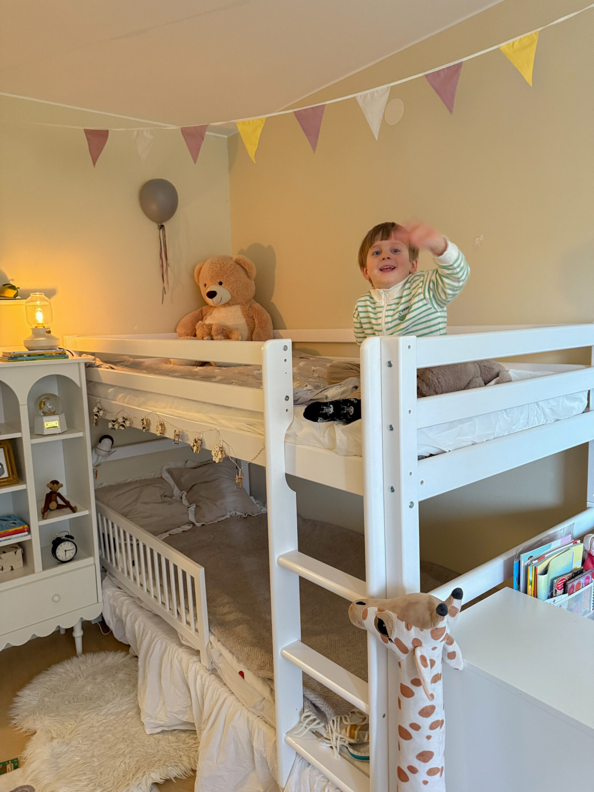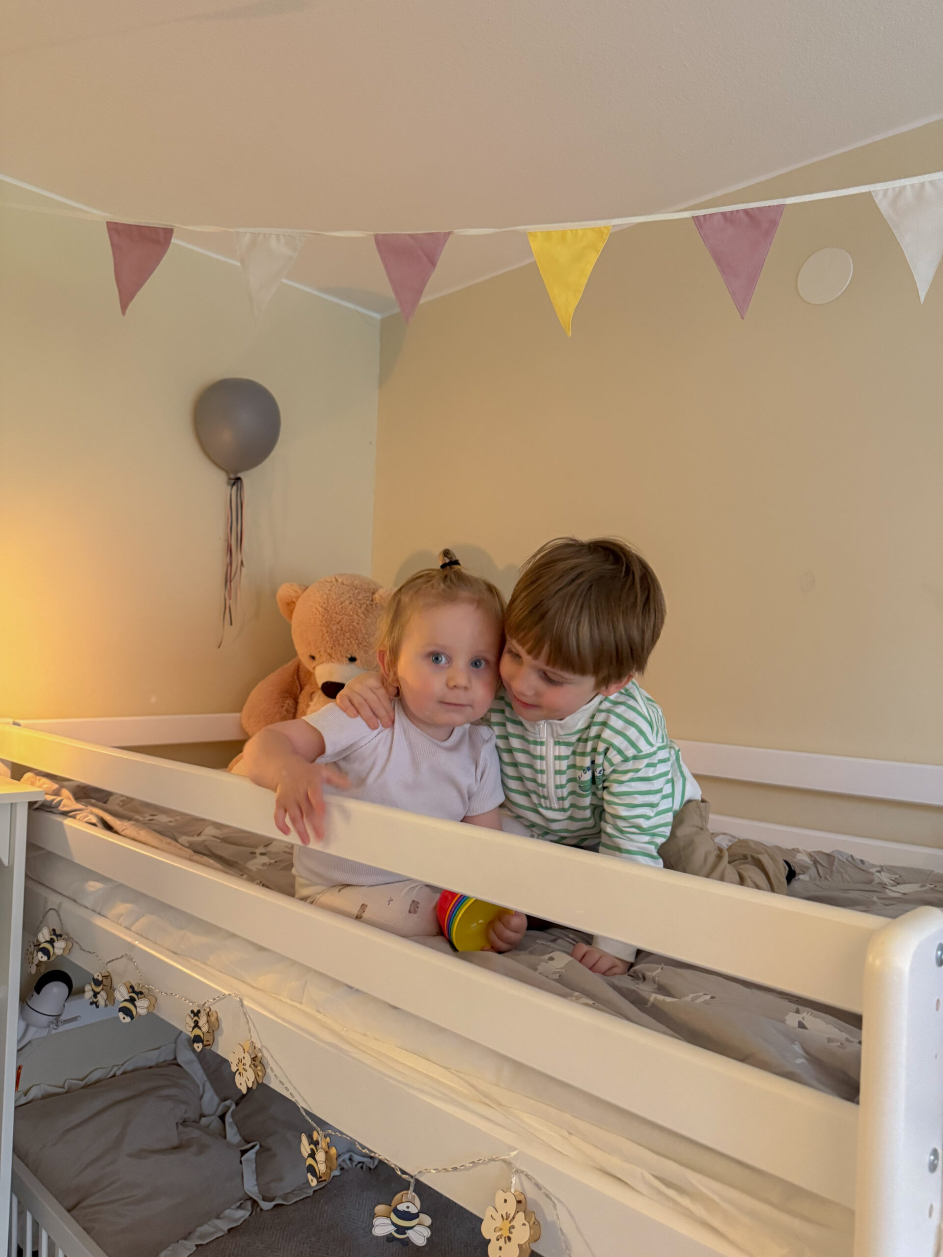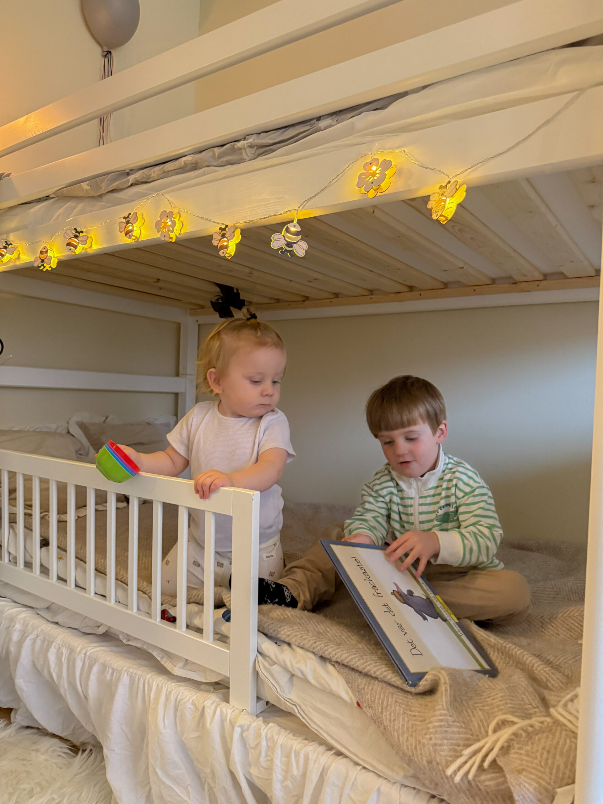 Leonard älskar att klättra upp till översängen via stegen (som dessutom tränar balans och koordination), medan Bernard tycker det är mysigt att krypa upp i nedre sängen och läsa. Det har redan blivit deras lilla plats för både lek och mys.