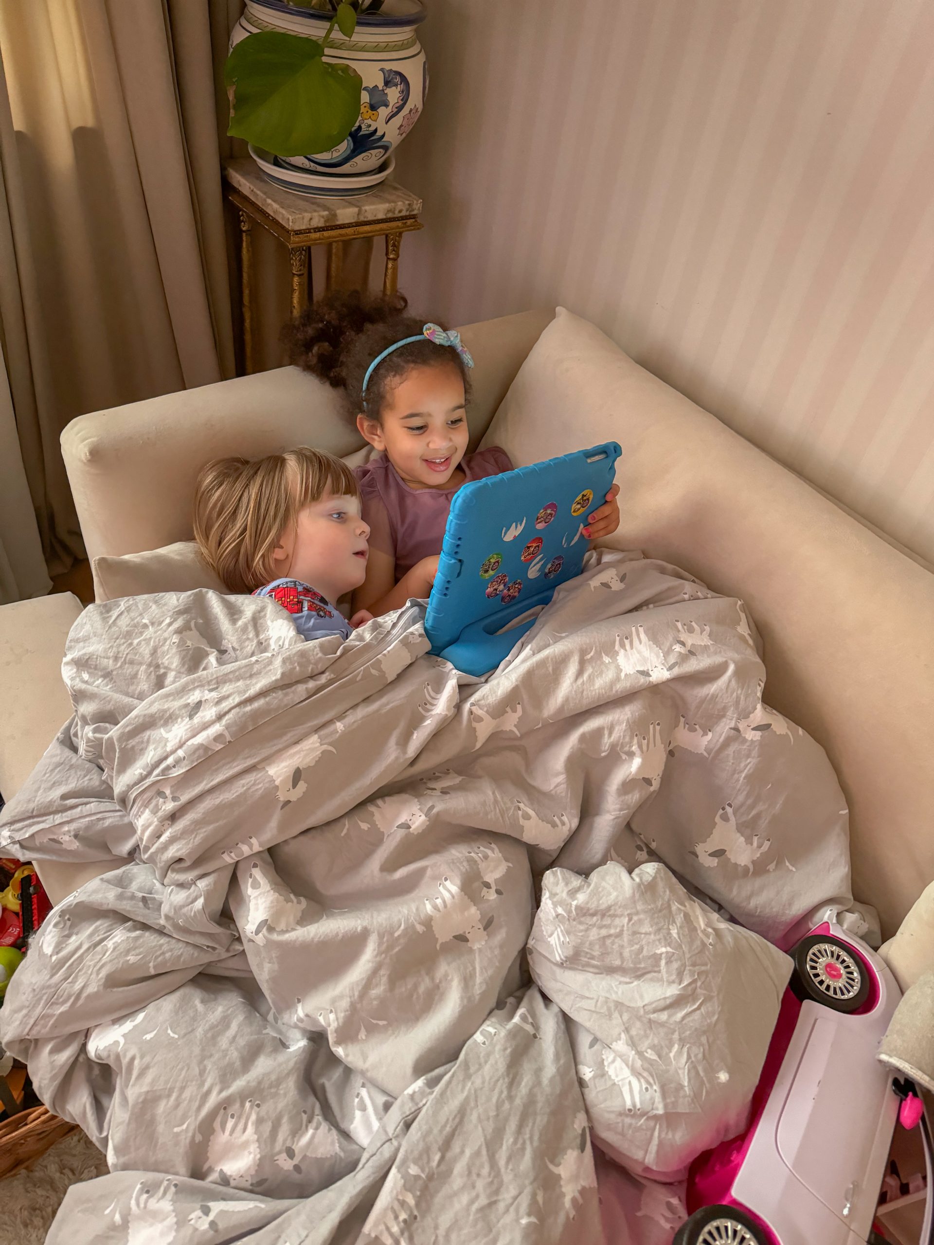 Fredagen här hemma var dock sypermysig. Då hade vi Leonards fina vän och hennes fantastiska mamma över. Barnen lekte, åt korv och myste i soffan. Vi mammor fick äta supergod indisk middag rätt så ostört faktiskt. Det var fantastiskt lyxigt. Jag uppskattar verkligen såna här småsaker nu när inget är speciellt roligt. Jag vill bara att bebis ska komma nu så att jag kan få bli mig själv. Jag saknar min energi, mitt go, min kropp, min ork och allt det där. Men snart så!