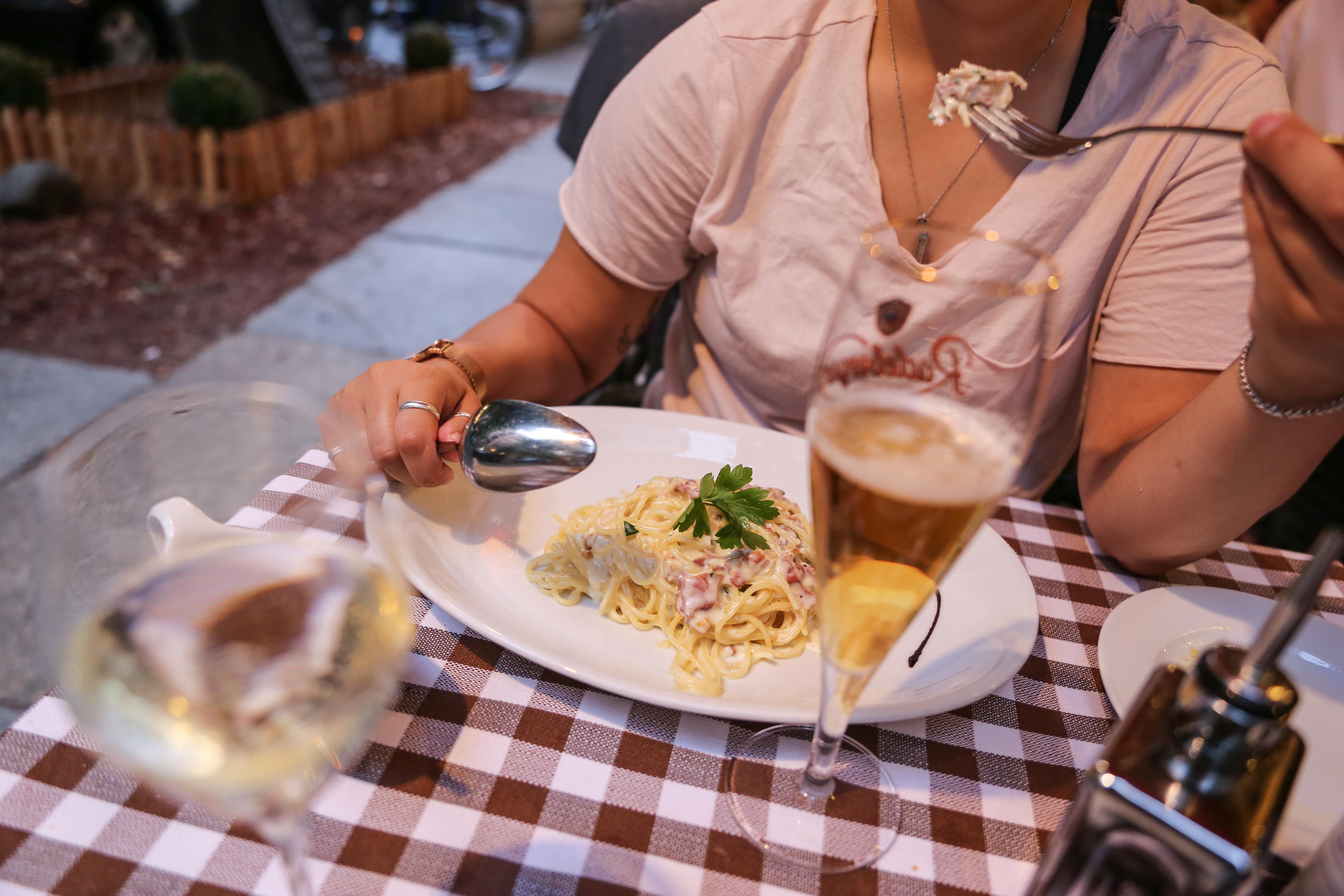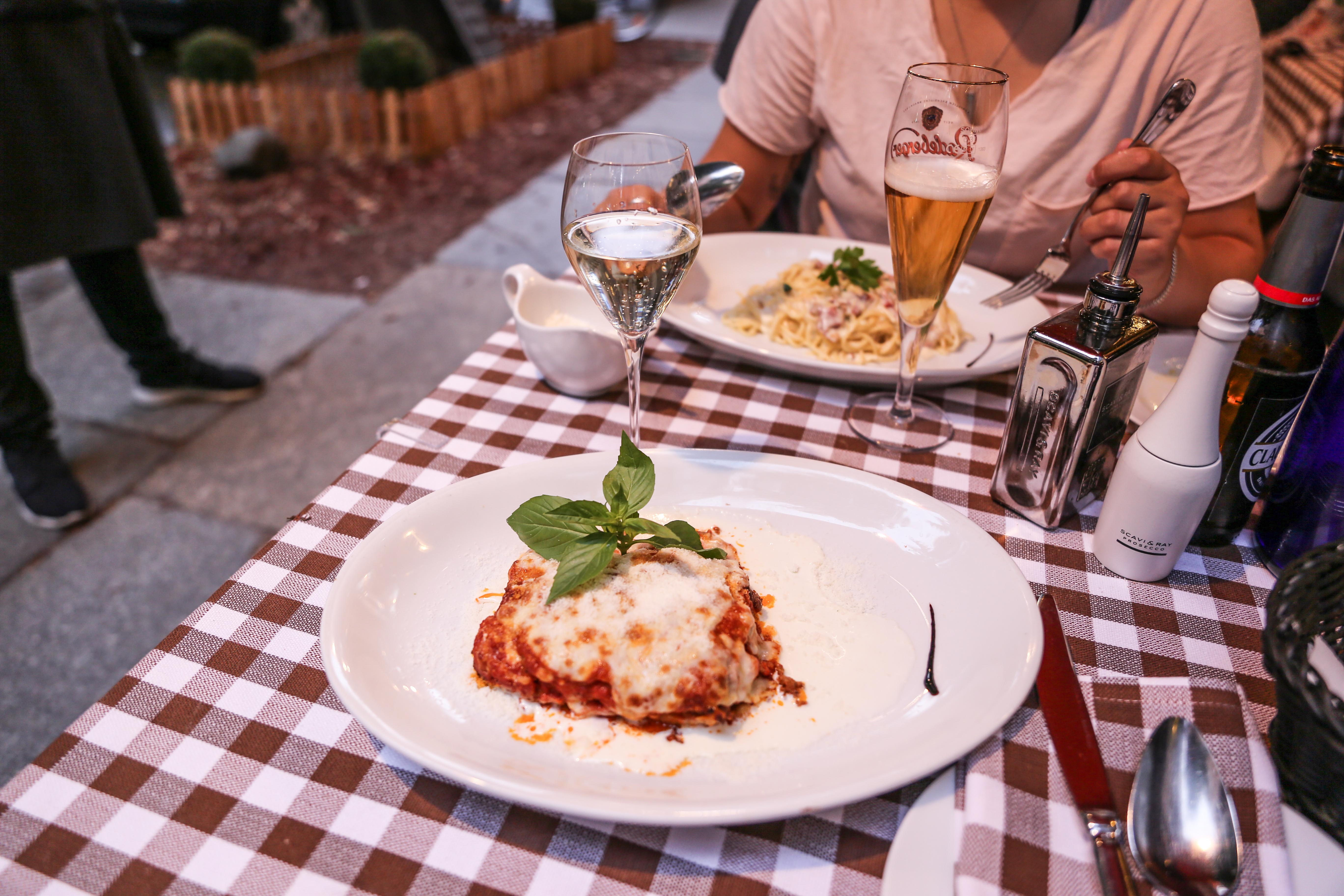 Jösses vilket otydligt och osammanhängande blogginlägg jag skrev igår. Märkte nog inte hur trött jag var… 😛 Som jag nämnde igår gick jag och hjärtat spontant förbi en trevlig Italiensk restaurang i krokarna där vi bor vi kunde inte bara passera så vi satte oss ned och åt middag. Vi hade båda totalt glömt bort att äta middag så strax efter klockan 21 var det nog hög tid att äta lite. Jag tog en lasagne och hon tog en pasta carbonara. Så gott!! Vi delade lite på maten som vi brukade!