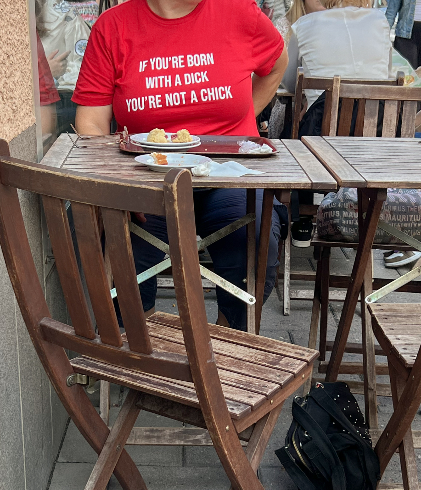 Är så trött på detta transhat. VEM kan ens gå ut med en sån här T-shirt? Jag ville så gärna konfrontera hen, men förmdligen hade det inte lett någonstans.