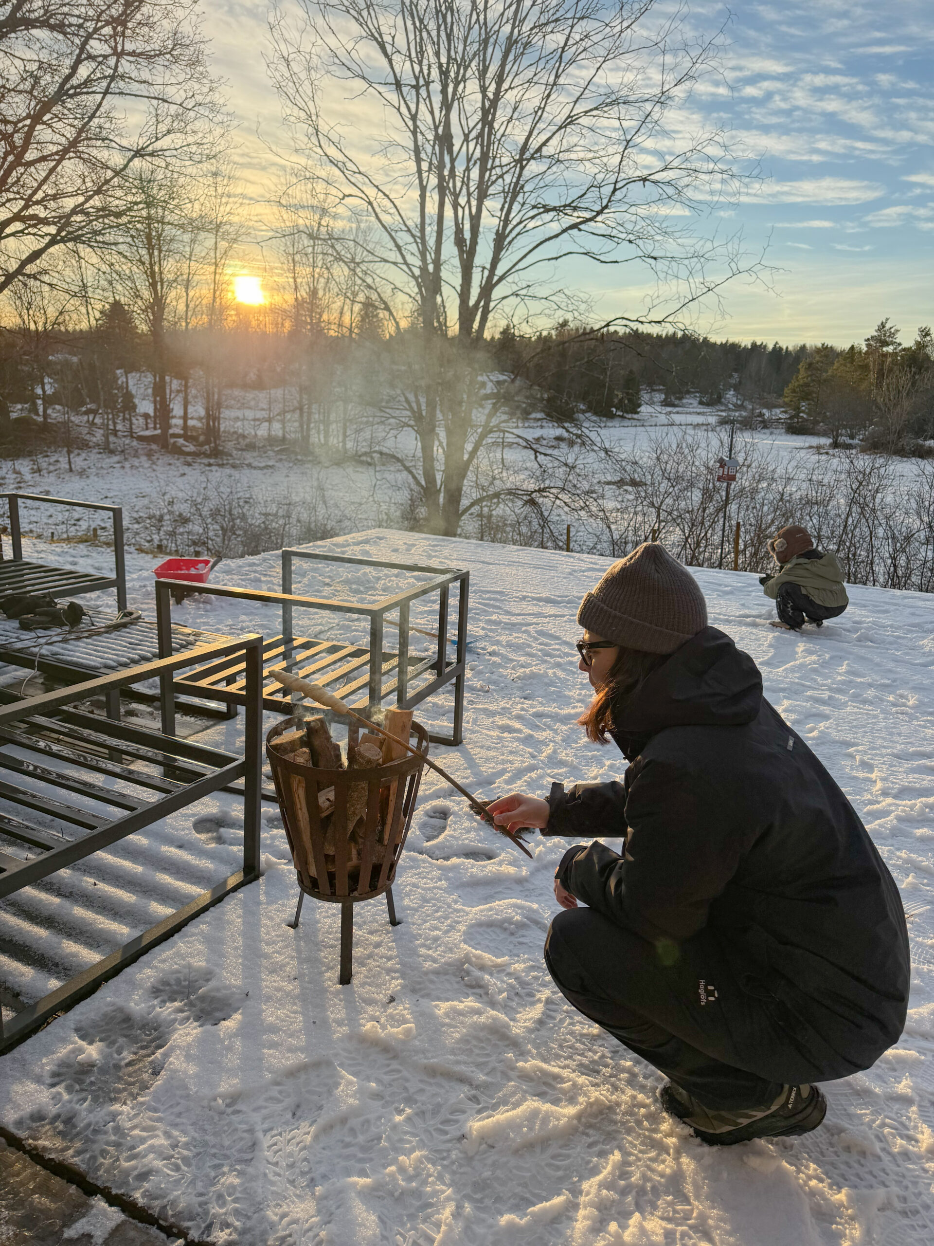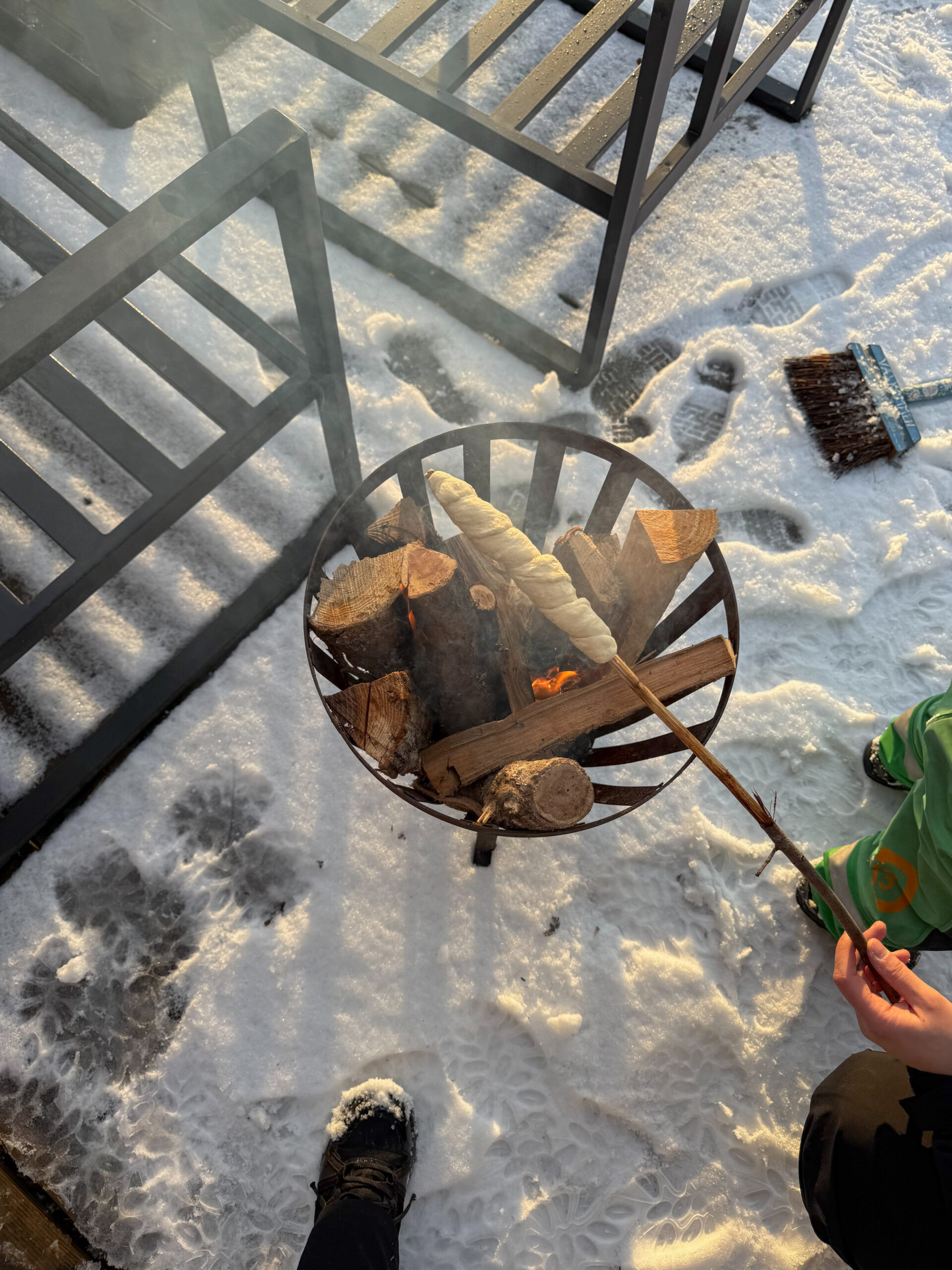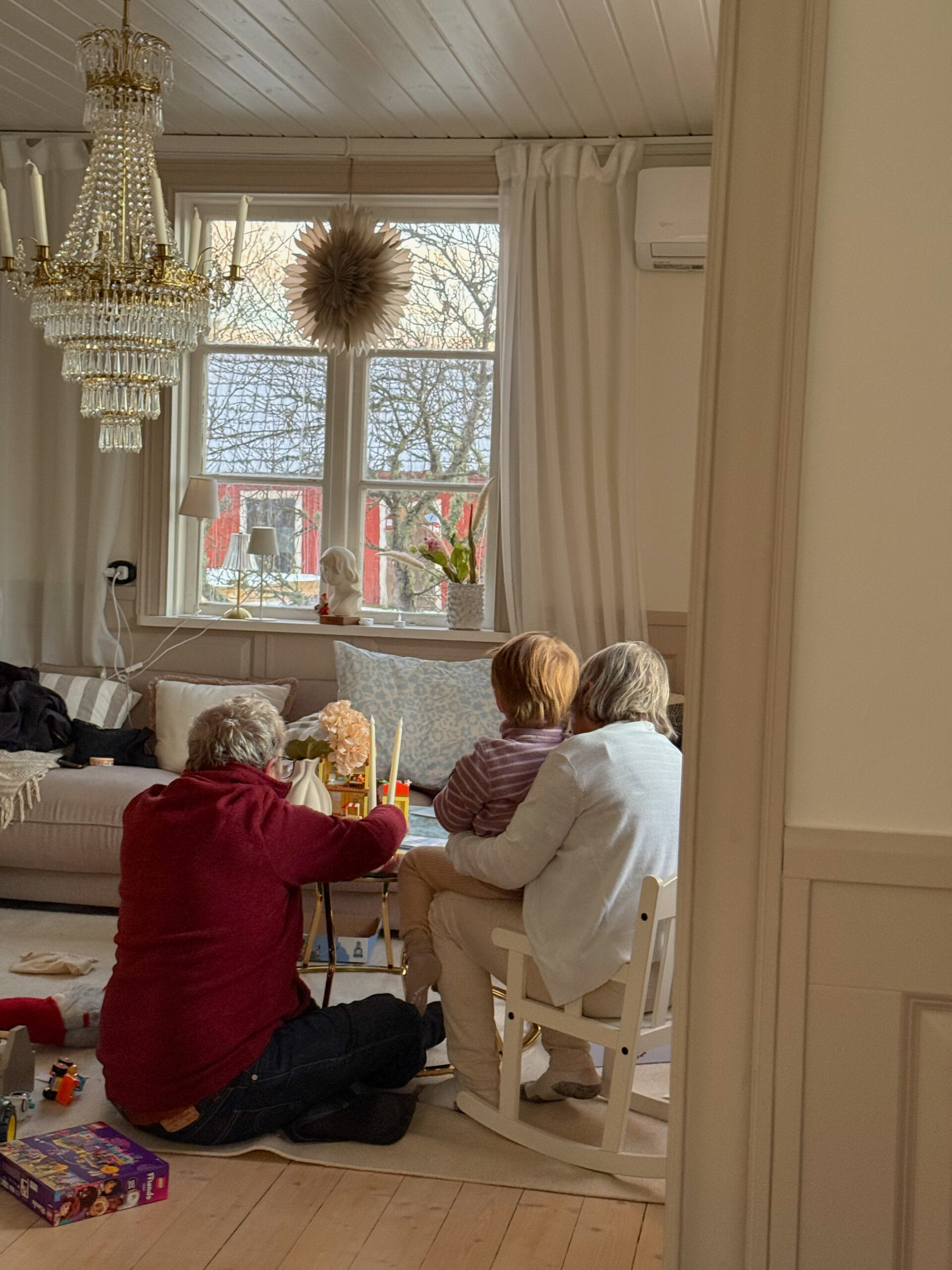 Igår åkte vi som sagt ut till landet och här kommer vi att vara i ett par dagar för att bara koppla av. När vi kom fram igår gav vi oss ut på gården, tände en brasa utomhus och började grilla både korv och pinnbröd. Detta är ju sådana barndomsminnen för mig. Livia grillade aldrig pinnbröd som barn. Kanske var något man endast gjorde i Värmland? Hur som helst så är det ju så mysigt och så gott. Extra saltat smör och ost som tillbehör är mumma. Det blev en massa lek och fix ute på gården innan vi gick in för att leka. Mormor och morfar kom också på besök så vi alla satte oss på golvet för att bygga med lego. Leonard fick Bluey lego i julklapp, ett megastort så vi alla hade att greja med om vi säger så.
