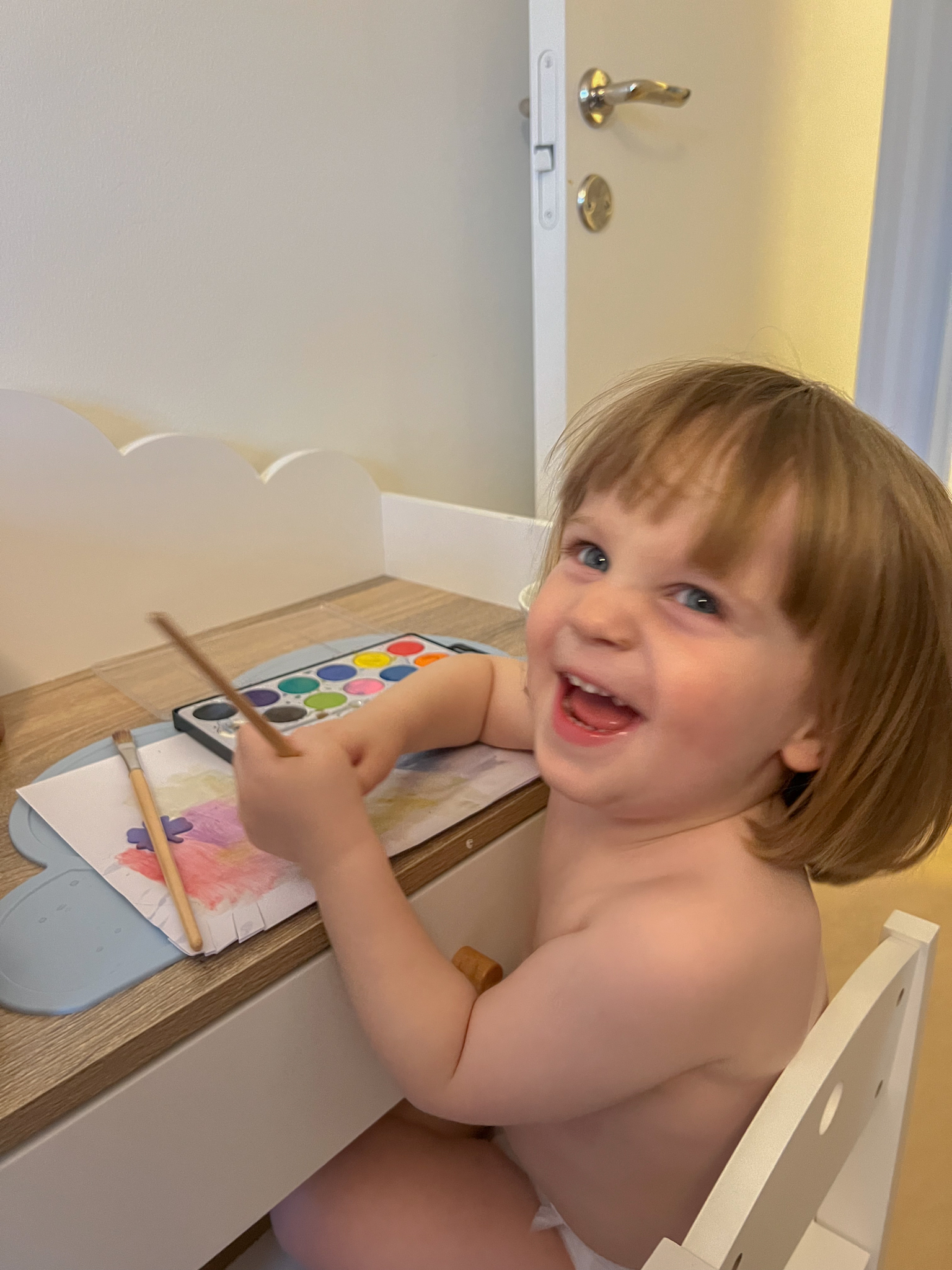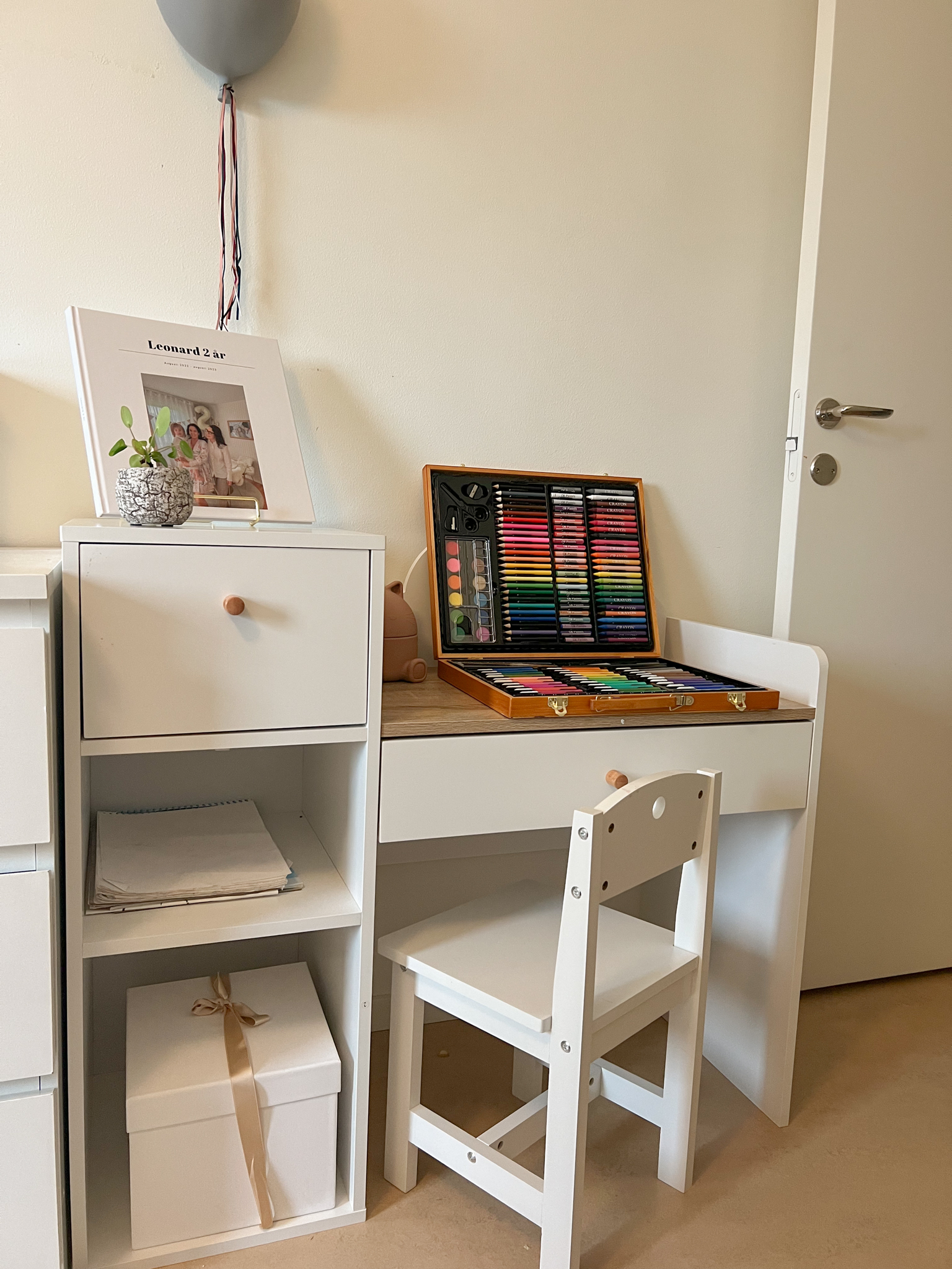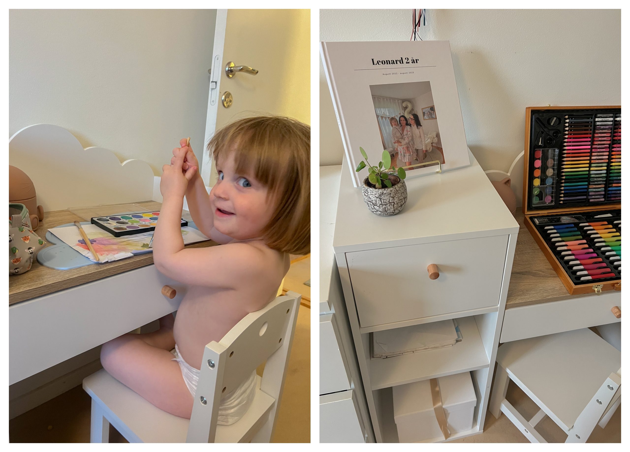 Visst blev det fint? Detta skrivbordsset passade så bra i Leonards fina, lilla och mysiga rum Vi har fått en hel del teckningar att sätta upp på kylen 🙂