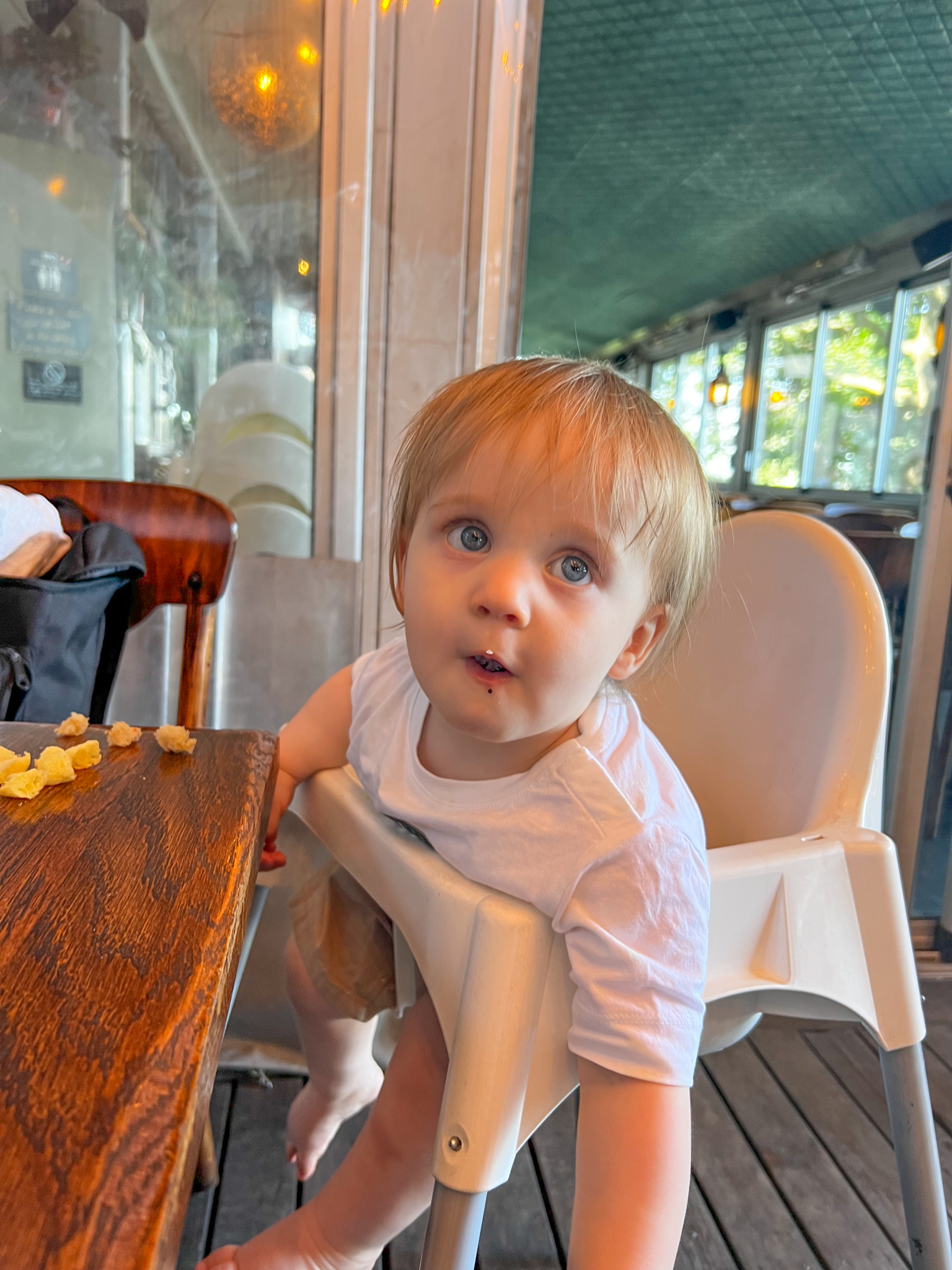 Jag frågade servitrisen om man fick en skiva bröd till maten. Leonard älskar bröd och ingen av maten lämpade sig för honom. Det enda dem erbjöd barn var sockriga pannkakor. Hur som helst så såg vi på notan att dem hade tagit 80 (!!) kr för denna brödskiva. Det är alltså en pizzadegsbit (bröd och vatten).. Lite saftigt va?
