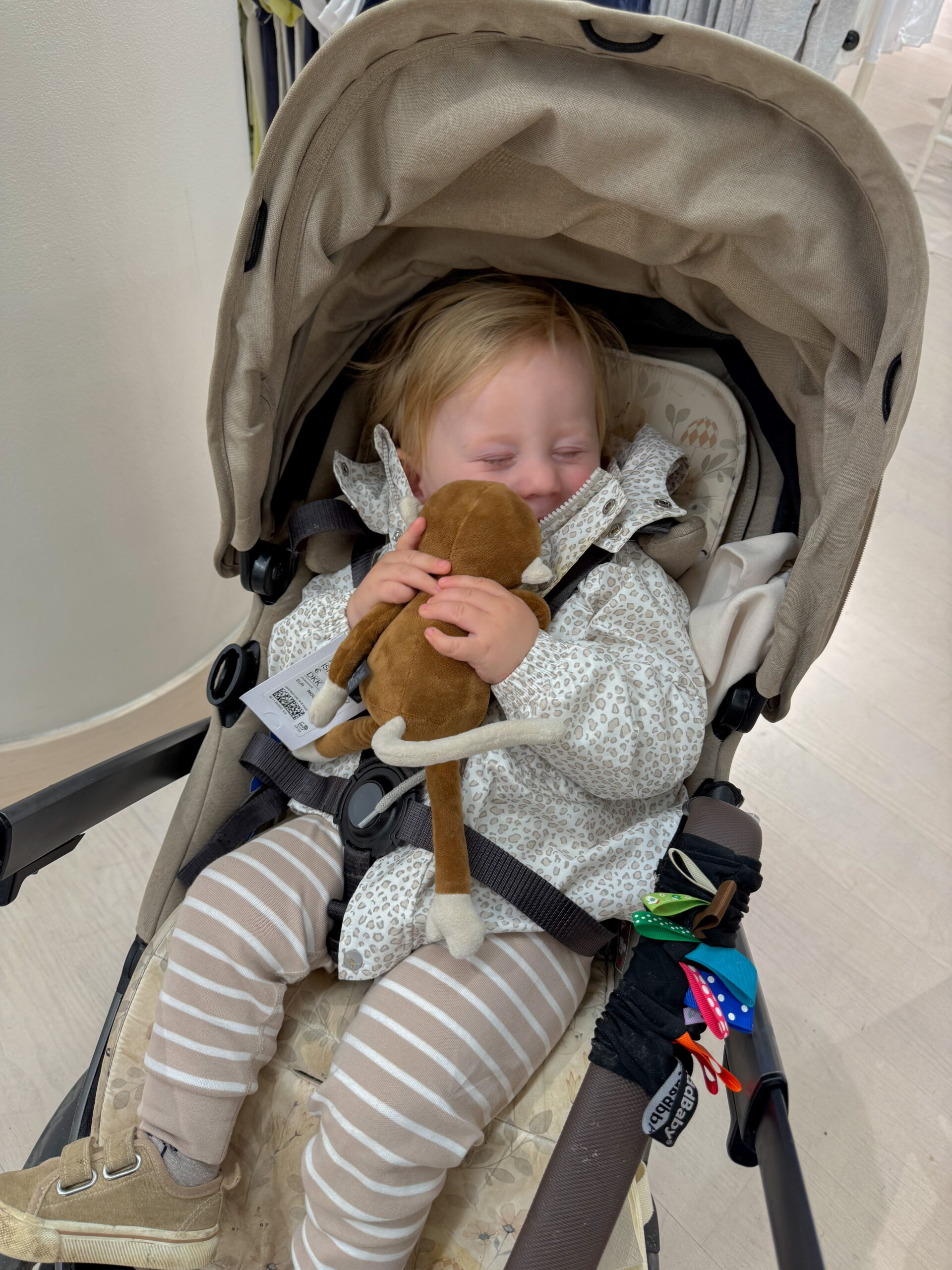Innan vi åkte hem för att hämta storebror gick vi in till H&M på fältöversten. Köpte vantar till barnen och lilla B fick syn på denna. Apan fick givetvis följa med oss hem 🙂 Han älskade den!