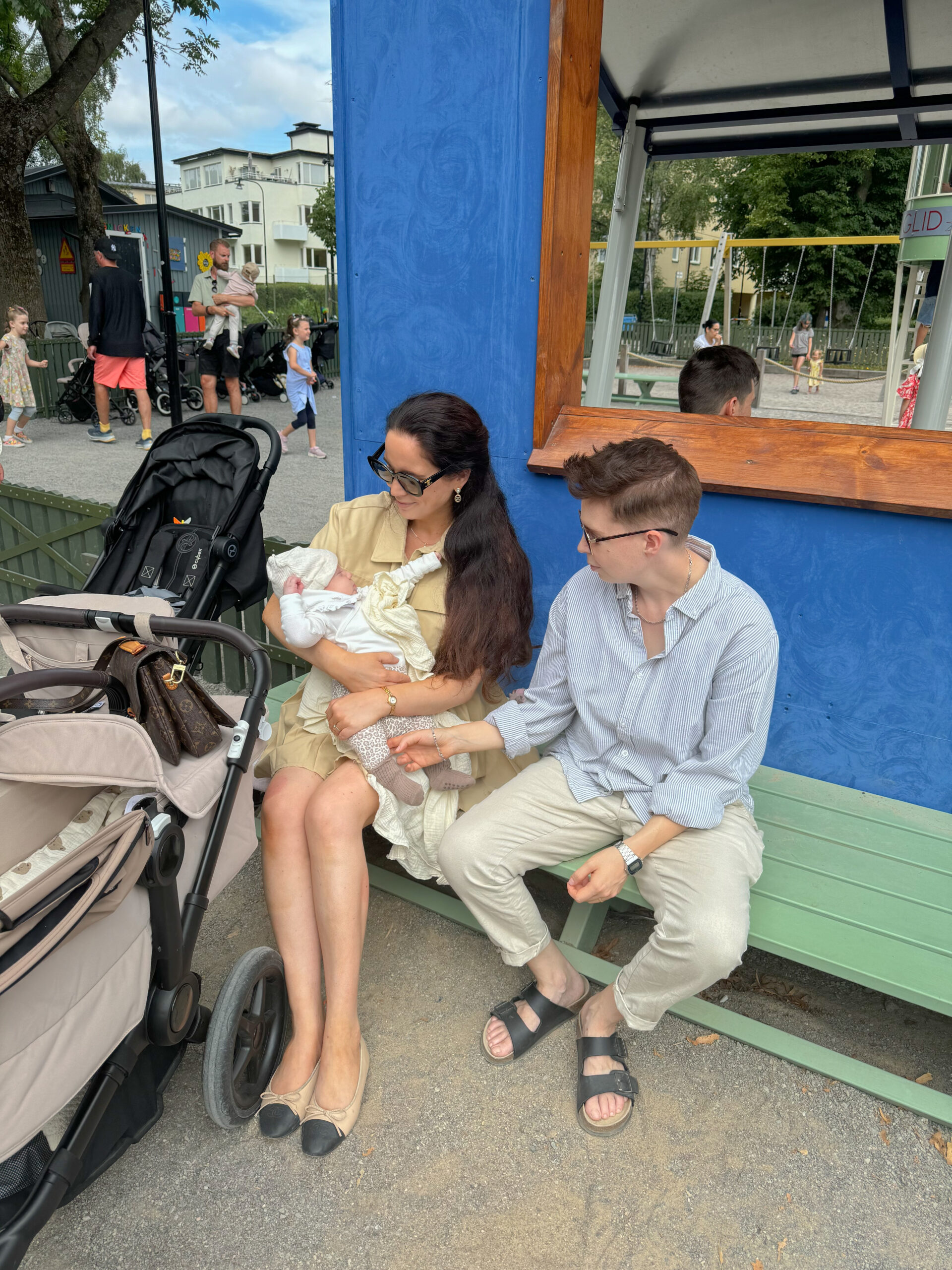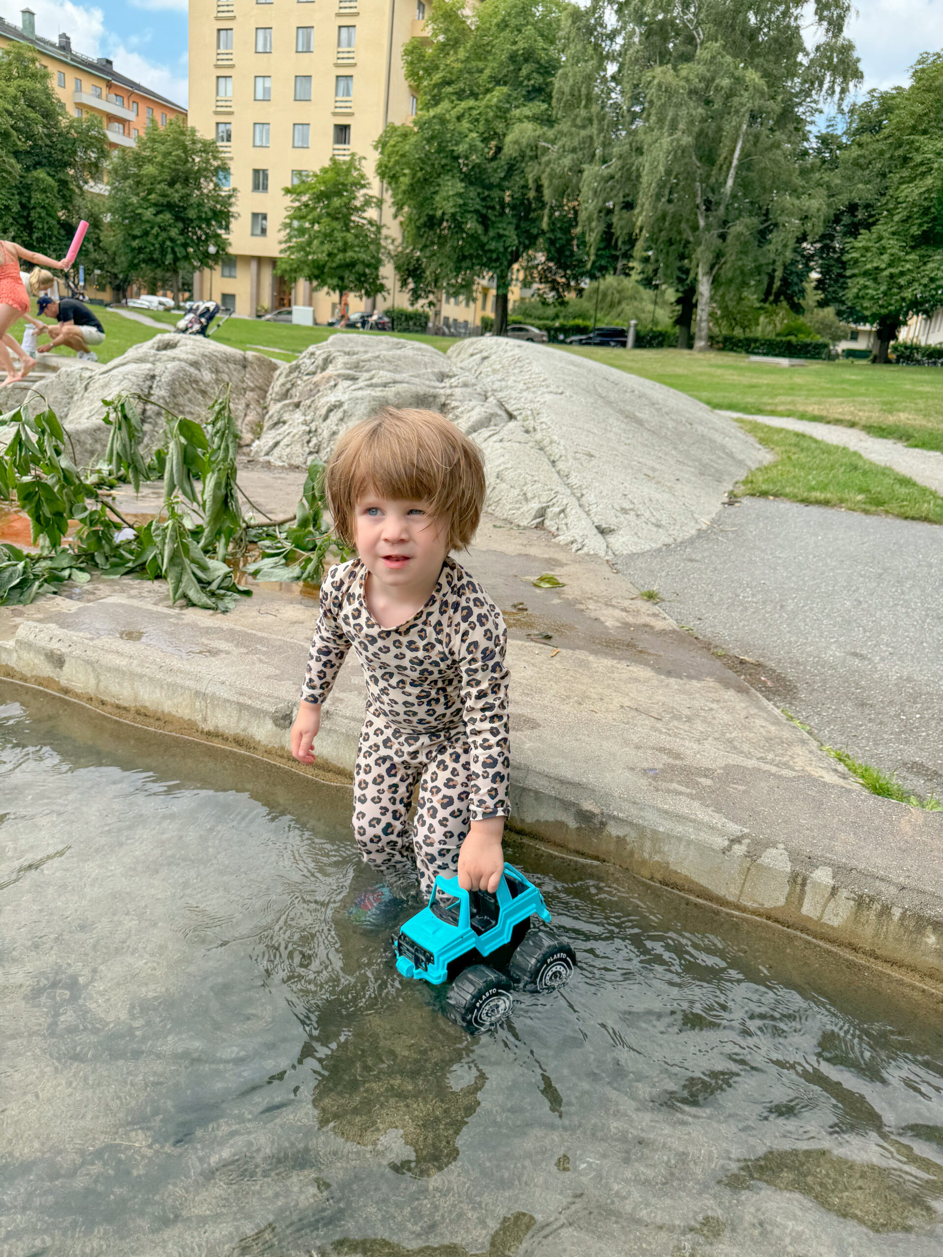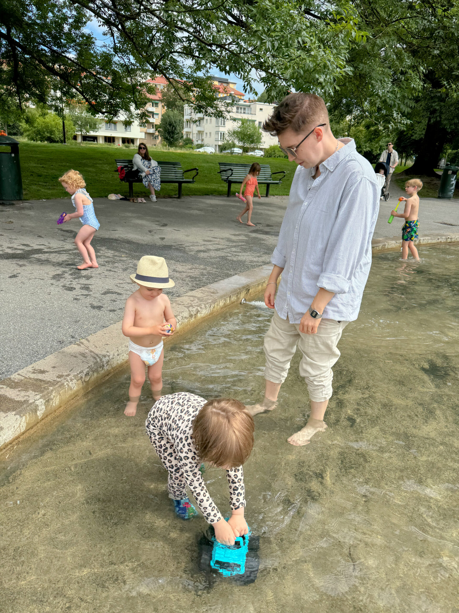 Igår var vi ute från morgon till kväll. Vi var så slut hela familjen när vi kom hem igår kväll. Är så lycklig över sådana dagar. Lek, bus, svettiga och glada barn. Sommaren är verkligen underbar på alla sätt. Jag och Livia pratade om hur olika liv man lever här i Sverige på sommaren och på vintern. Det går liksom inte att jämföra. I går under tidig förmiddag mötte vi upp mitt storasyskon med familj för lek i dagens första park. Vi möttes vid Tessinparkens parklek som är en favoritplats för oss. Här fick kusinerna busa tillsammans LÄNGE. Bernard sov så jag och Jejja kunde få prata i lugn och ro medan de andra lekte med barnen. Skönt! Barnen var så svettiga efter bus i parken så ett dopp i plaskdammen var givet innan det blev lunch. Leonard älskar verkligen att bada och den lilla plaskdammen i Tessinparken gick hem dem också om man säger så.