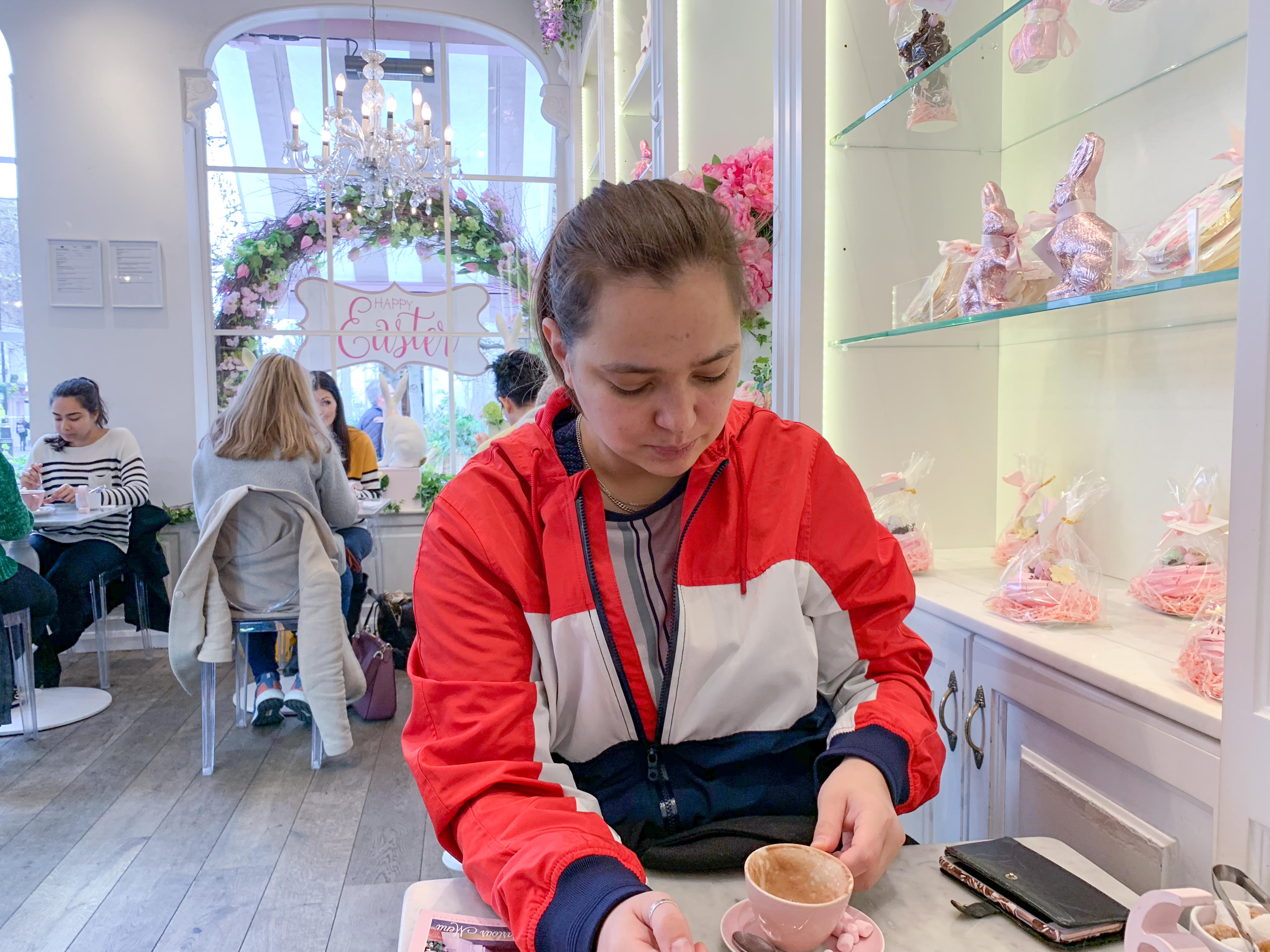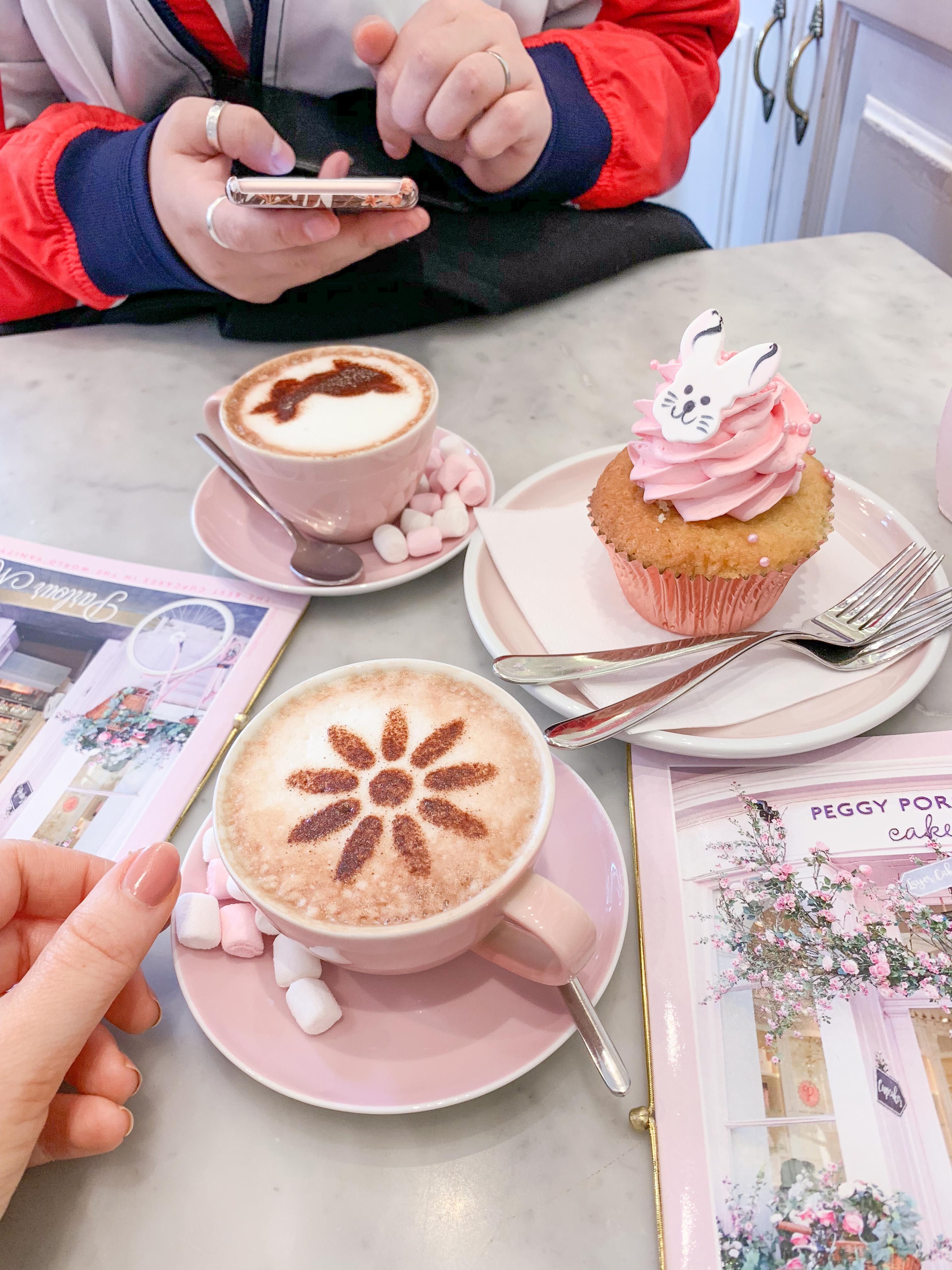 Häromdagen gick jag och hjärtat upp tidigt för att säkra en plats på Londons mysigaste café. Peggy Porschen cakes. Denna plats är magisk. Inte nog med att det är så fint, trevligt och ljuvligt så har dem även dem bästa bakverken. Deras choklad är mumma och jag var tvungen att beställa in den igen. Jag har varit här förut och jag vet hur mycket folk det brukar vara. Sist jag var här gick kön två varv runt huset och folk var som galna. Inte undra på att dem måste ha en ”kö värd”. Att folk kan bråka över kaffe och bulle!