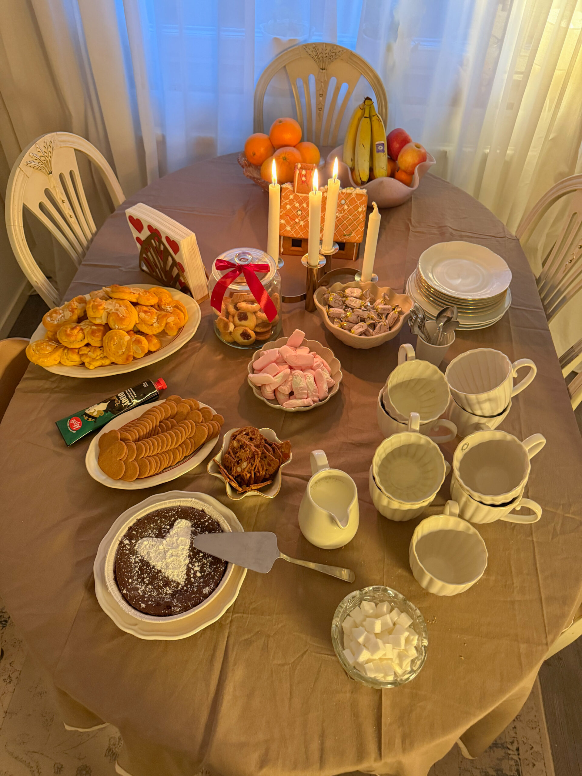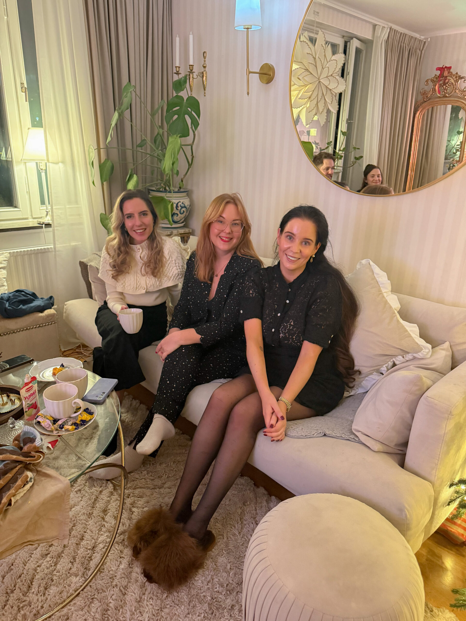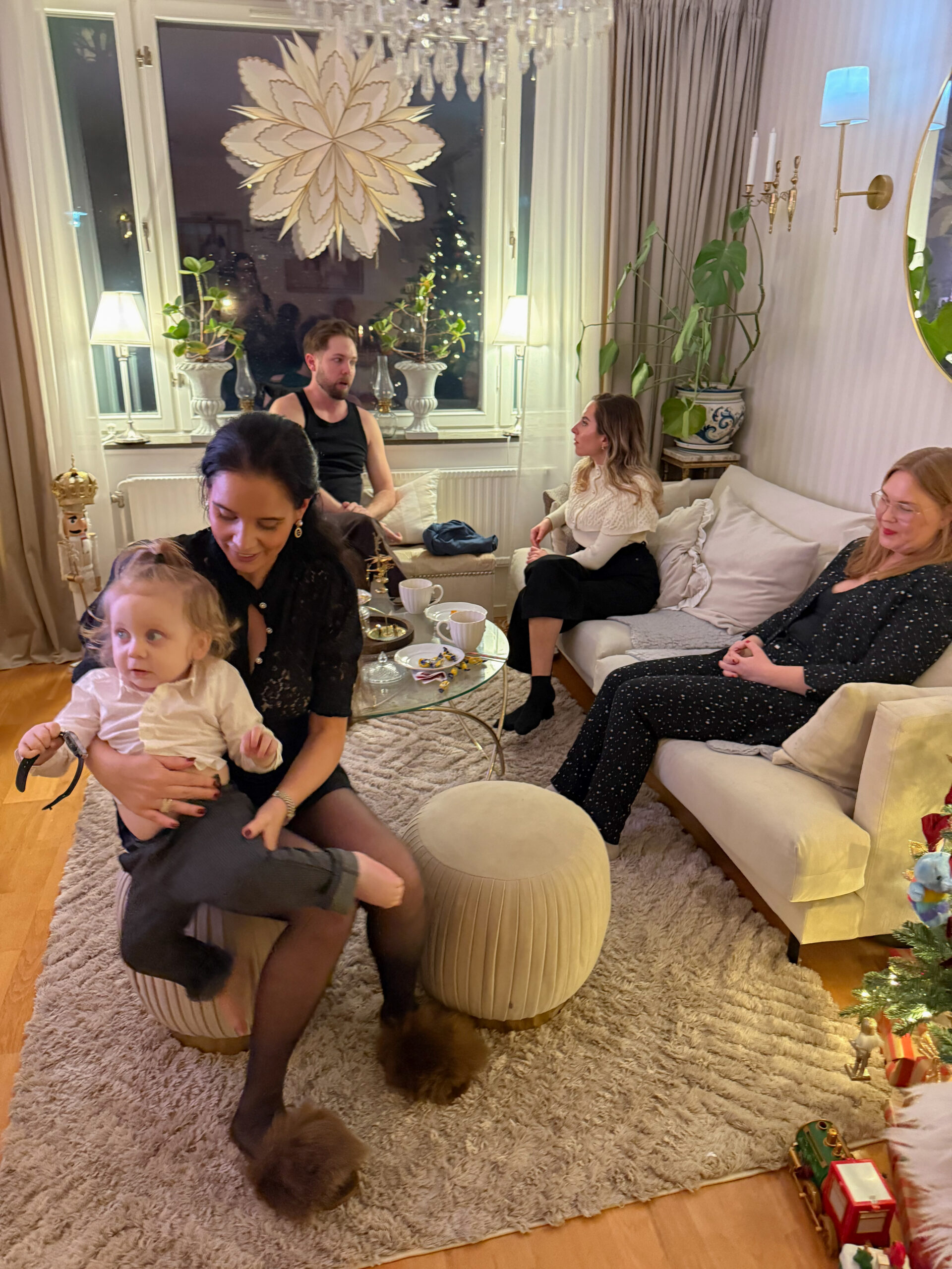 Igår bjöd vi in några vänner till oss. Tre vänner från min sida och tre vänner från Livias sida. Vi har delat upp lite julfiranden eftersom vi har blivit så många och detta var vårt andra julfirande i ordningen. Det var SÅ mysigt att få bjuda i lite vänner såhär en tredje advent hemma hos oss. Vi dukade upp med olika sorters glögg, kaffe, kladdkaka, egna lussebullar, pepparkakor med ädelost och en massa, massa mer. Julgodiset var populärt i alla fall hos Leonard hehe. Jag är så glad över att mina vänner matchar med alla och även tillsammans med Livias vänner. Jag älskar att verkligen att ha såna här små mysiga tillställningar hemma och lika så tycker barnen. Vi har ofta gäster hos oss så det är dem vana. Jag tycker det är så kul att även barnen uppskattar att få bort på middagar och att ha gäster hemma 🙂 Det är ju en sådan stor del av våra liv.