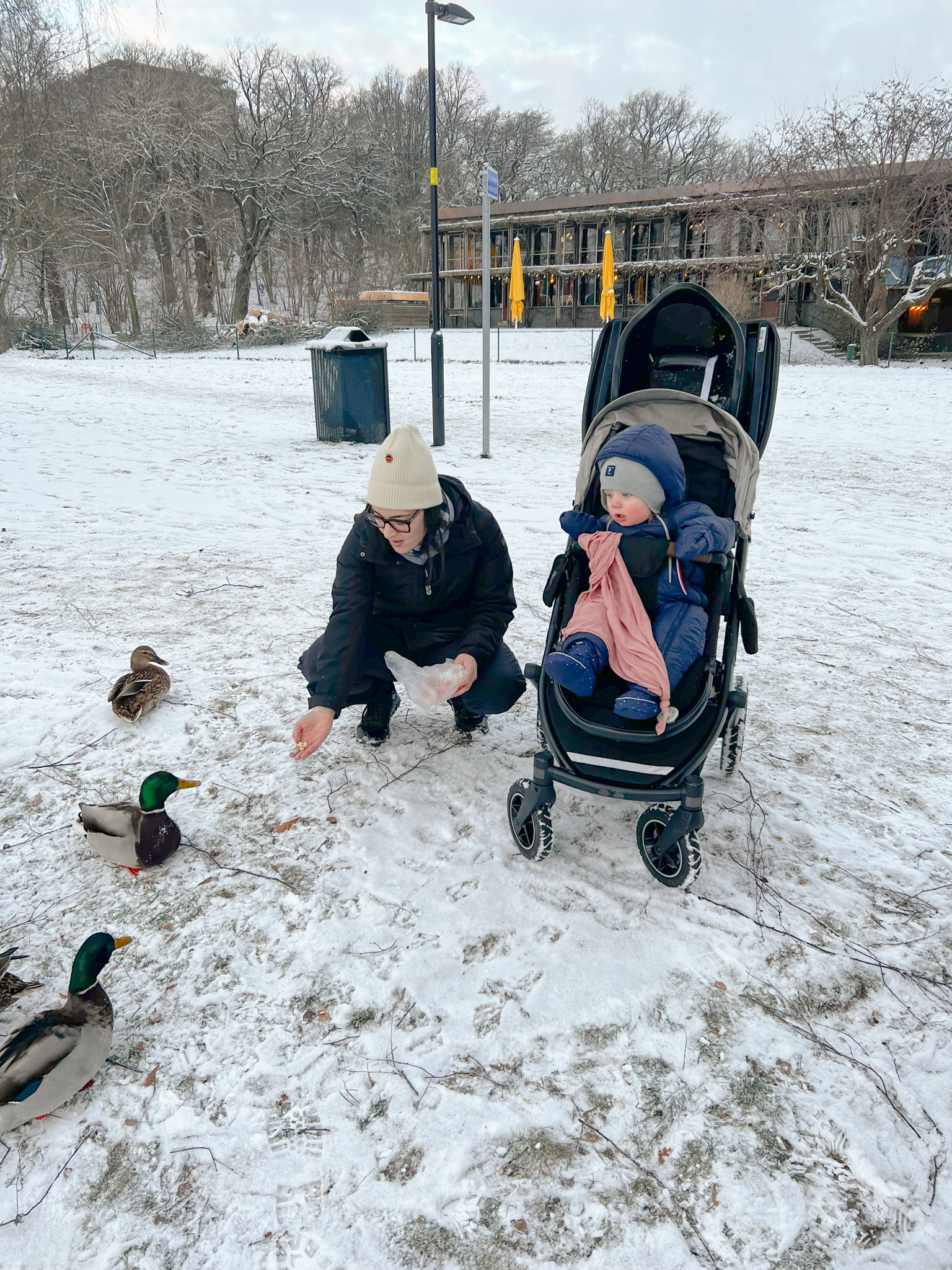 Igår skulle vi åka pulka tänkte vi. Sagt och gjort. Men vi kom inte särskilt långt då den lilla snön lurade oss. Vi fick snällt hämta vagnen istället. Vi gick och matade fåglarna vid vattnet istället