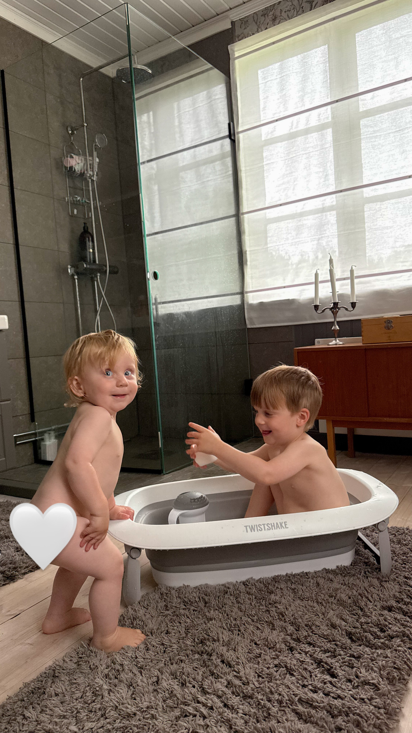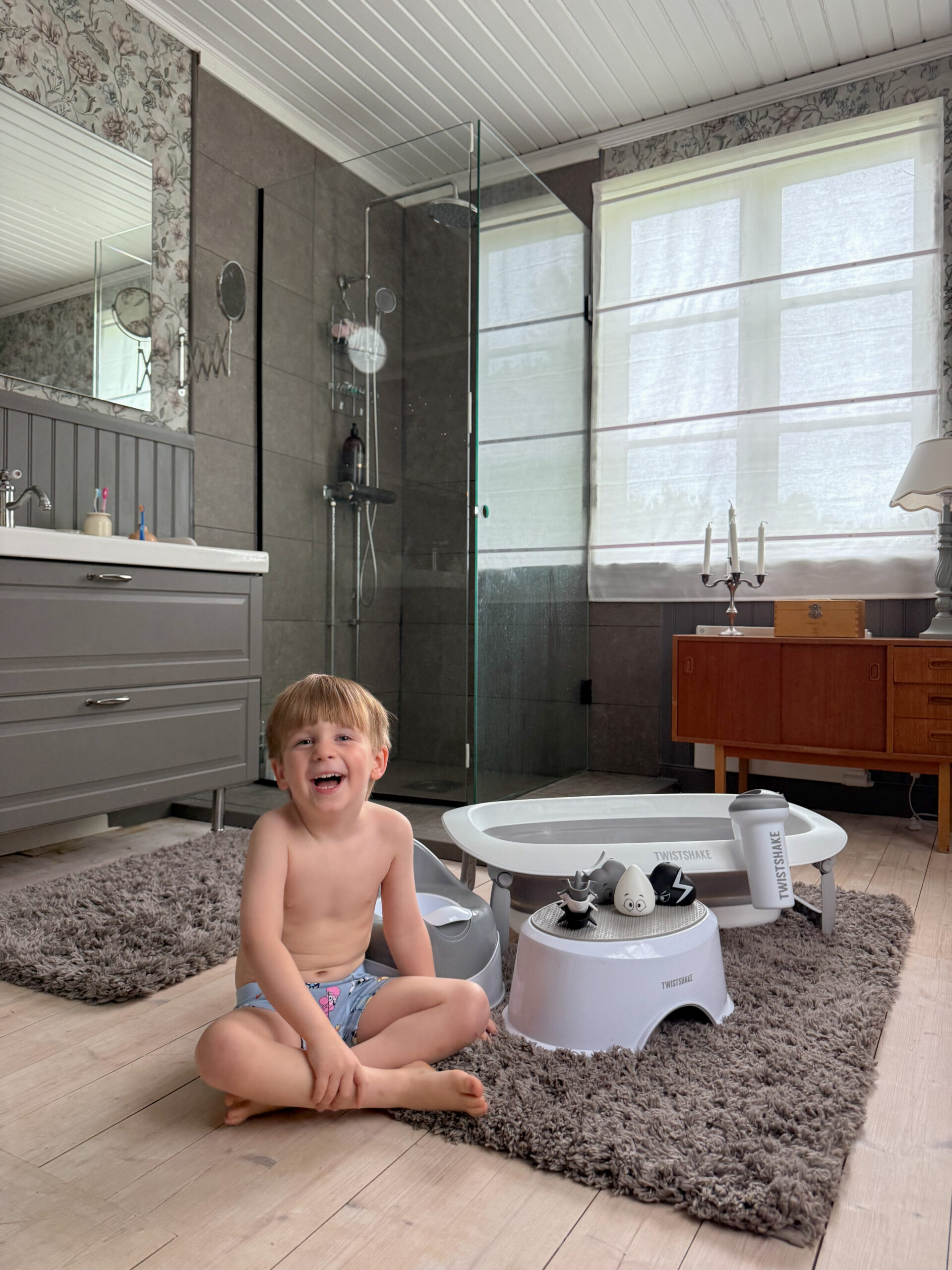 När Leonard föddes för lite drygt fyra år sedan köpte vi våra första badrumsprodukter från Twistshake, badkar och badkarskudde och jösses vad vi älskat dessa. Vi har älskat dem så mycket att fortfarande använder dem. Vi beställde faktiskt en lika dan uppsättning till landet så att vi kan förenkla livet där ute. Nu har även lillebror Bernard tagit över storebrors badkar, och det är så fint att se hur produkterna vuxit med familjen. Hela familjen ska givetvis vara med vid badet och det är så nice att vårt badrum är så stort. Här kan man liksom hänga. Badstunderna har alltid varit ett av våra mysigaste stunder tillsammans.