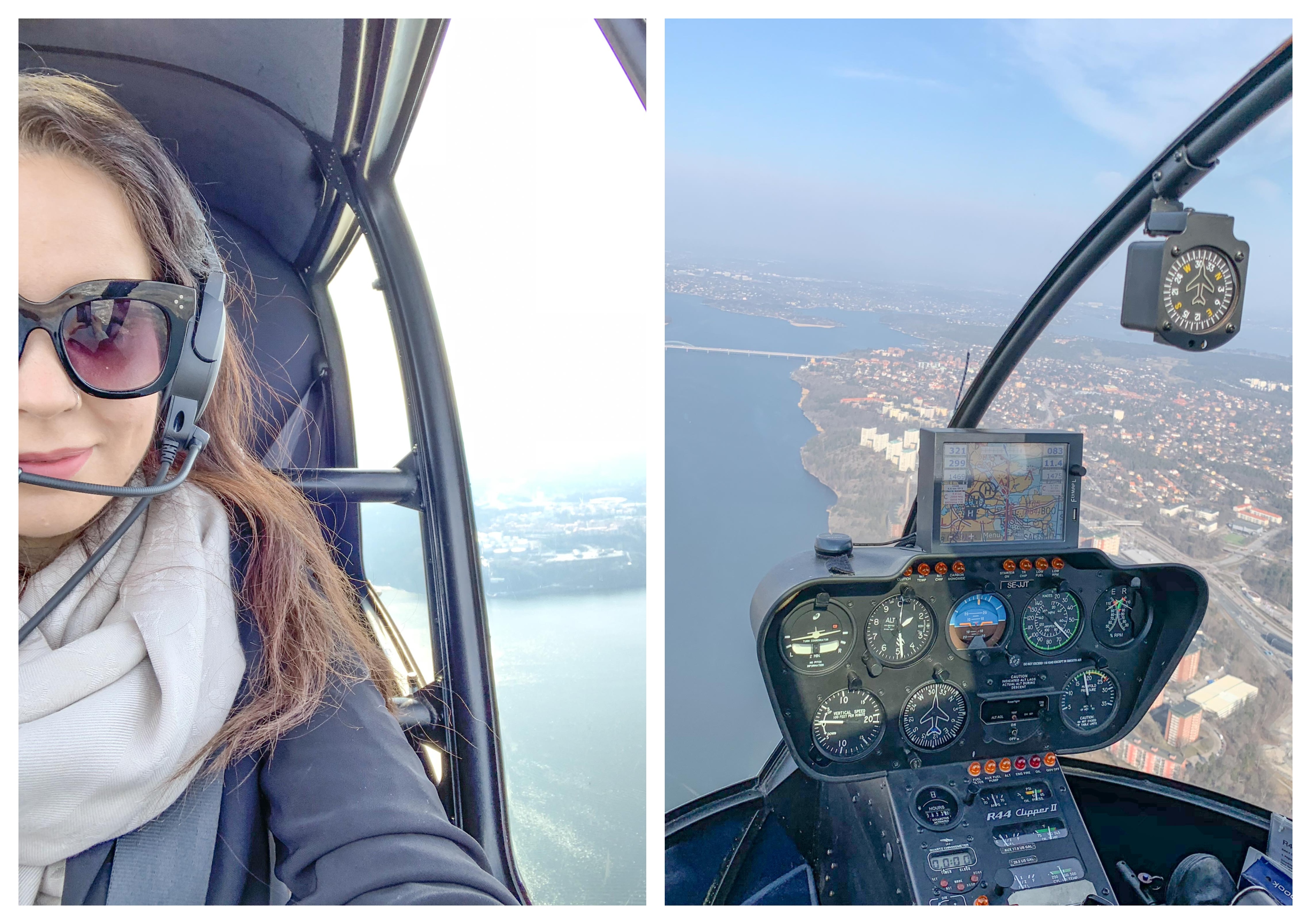 I våras köpte jag en upplevelsepresent från Happy-day och själva upplevelsen var en helikoptertur ovanför Stockholm. Ute på flygfälten innan turen började blev vi så bra mottagna av fin personal som pratade säkerhet och tips. Jag fick sitta längst fram i helikoptern bredvid piloten och det var wow. Maria fick snällt sitta bak hehe. Så fort helikoptern startade fick jag fjärilar i magen. Sån känsla! Wow. Kan liksom inte beskriva upplevelsen. Det var magisk. Stockholm såg ut som en konst-modell, likt en 3D målning.